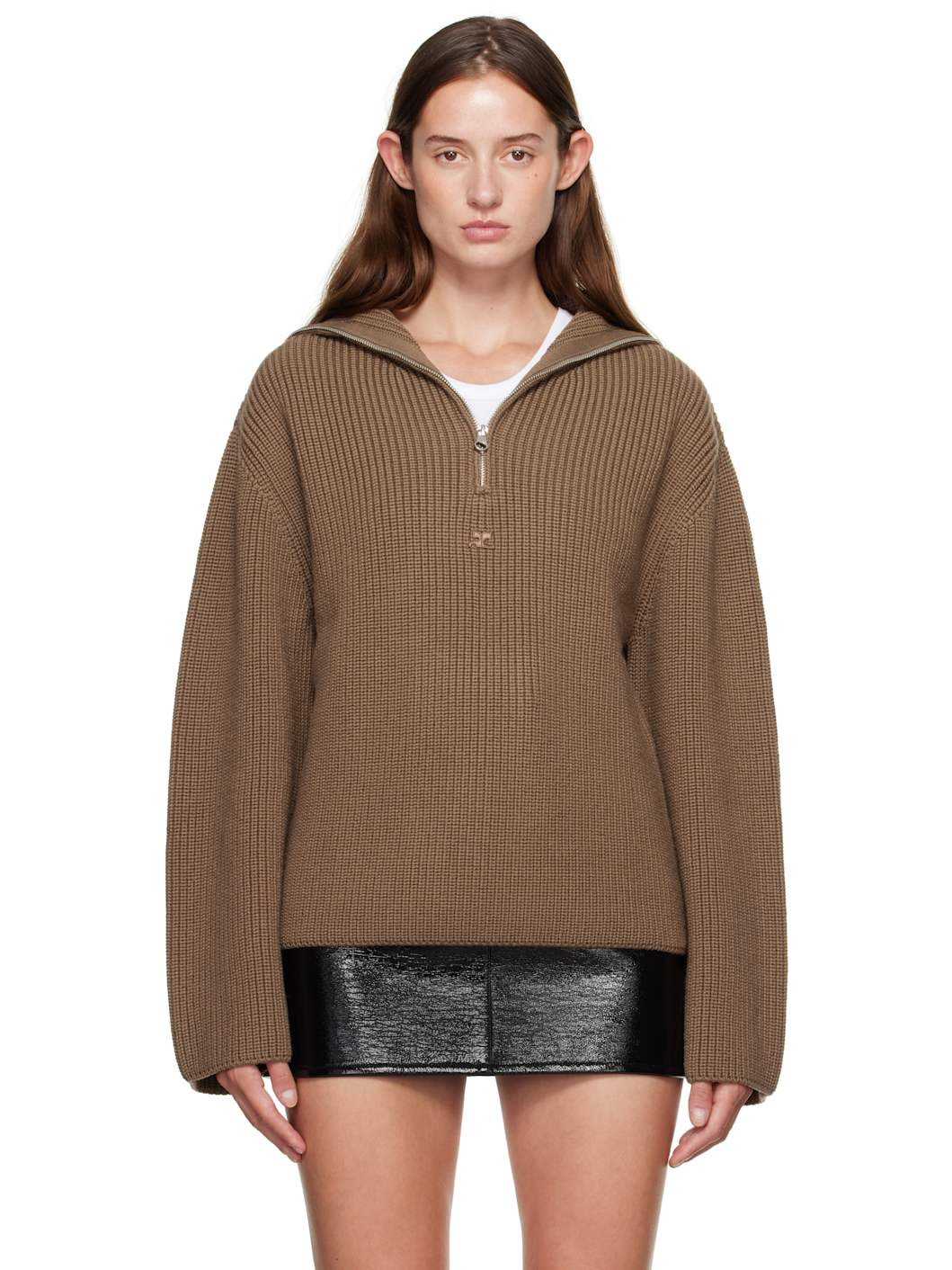 Rib-knit merino wool sweater. · Funnel neck · Half-zip closure · Logo embroidered at chest · Dropped shoulders Supplier color: Mocha 100% merino wool. Made in Portugal 252783F097004
