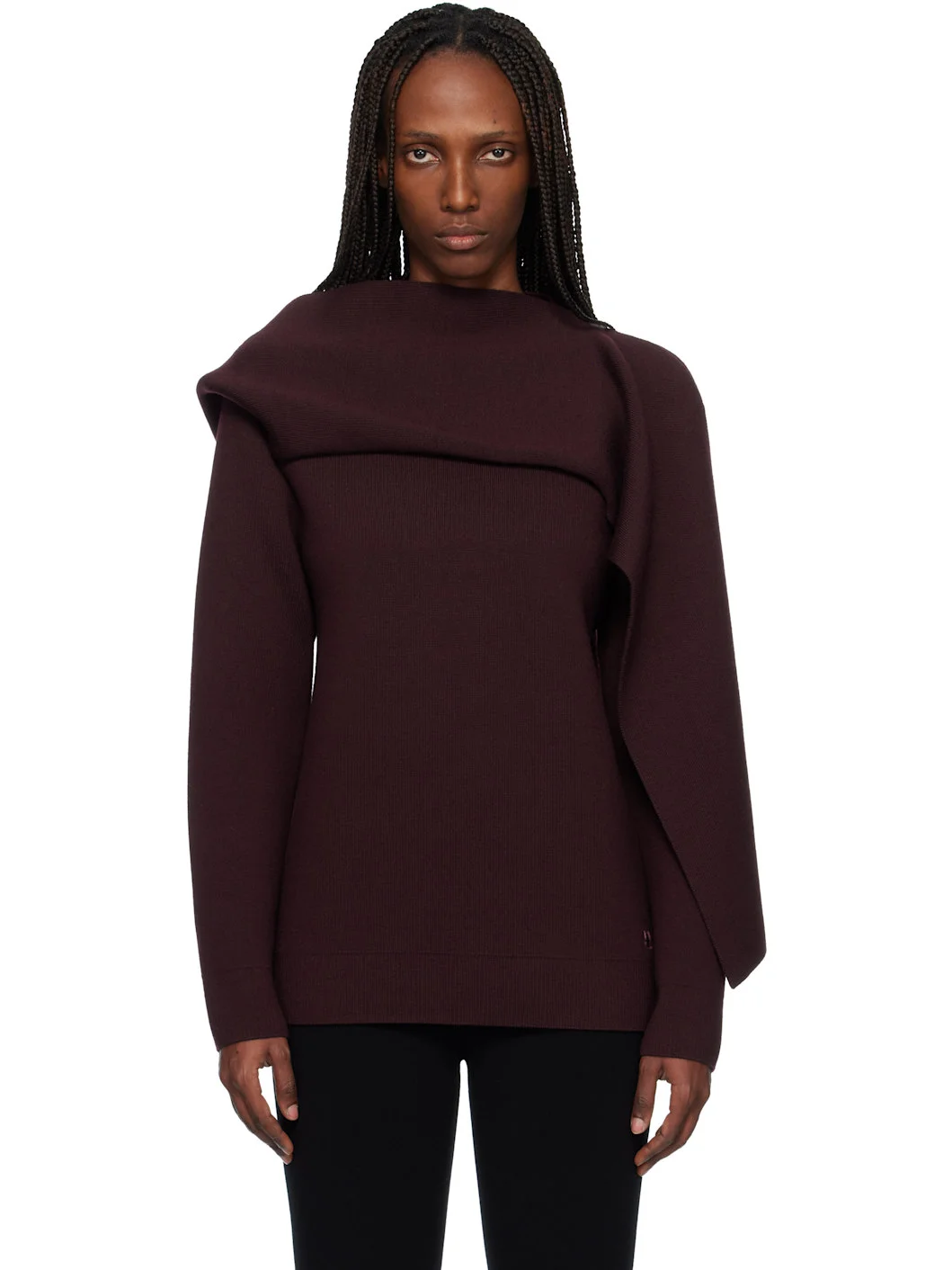 Oversized knit merino wool sweater. · Integrated scarf-style panel at collar · Rib-knit crewneck, hem, and cuffs · Logo embroidered at front · Button fastening at shoulder · Dropped shoulders Supplier color: Dark burgundy 100% merino wool. Made in Portugal 252783F096005