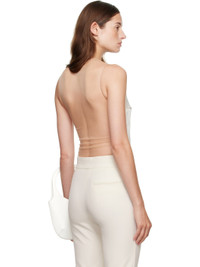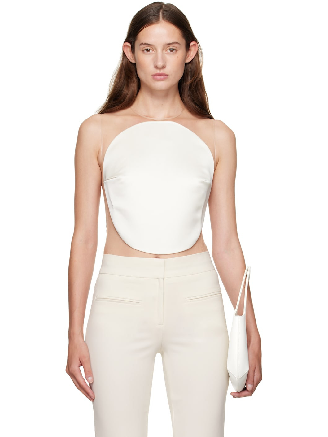 Sheer stretch tulle bodysuit. · Scoop neck · Satin panel with darts at chest · Press-stud fastening at bottom Supplier color: Ivory Body: 100% polyester. Body 2: 79% polyester, 21% elastane. Lining: 100% cotton. Made in France 252783F358003