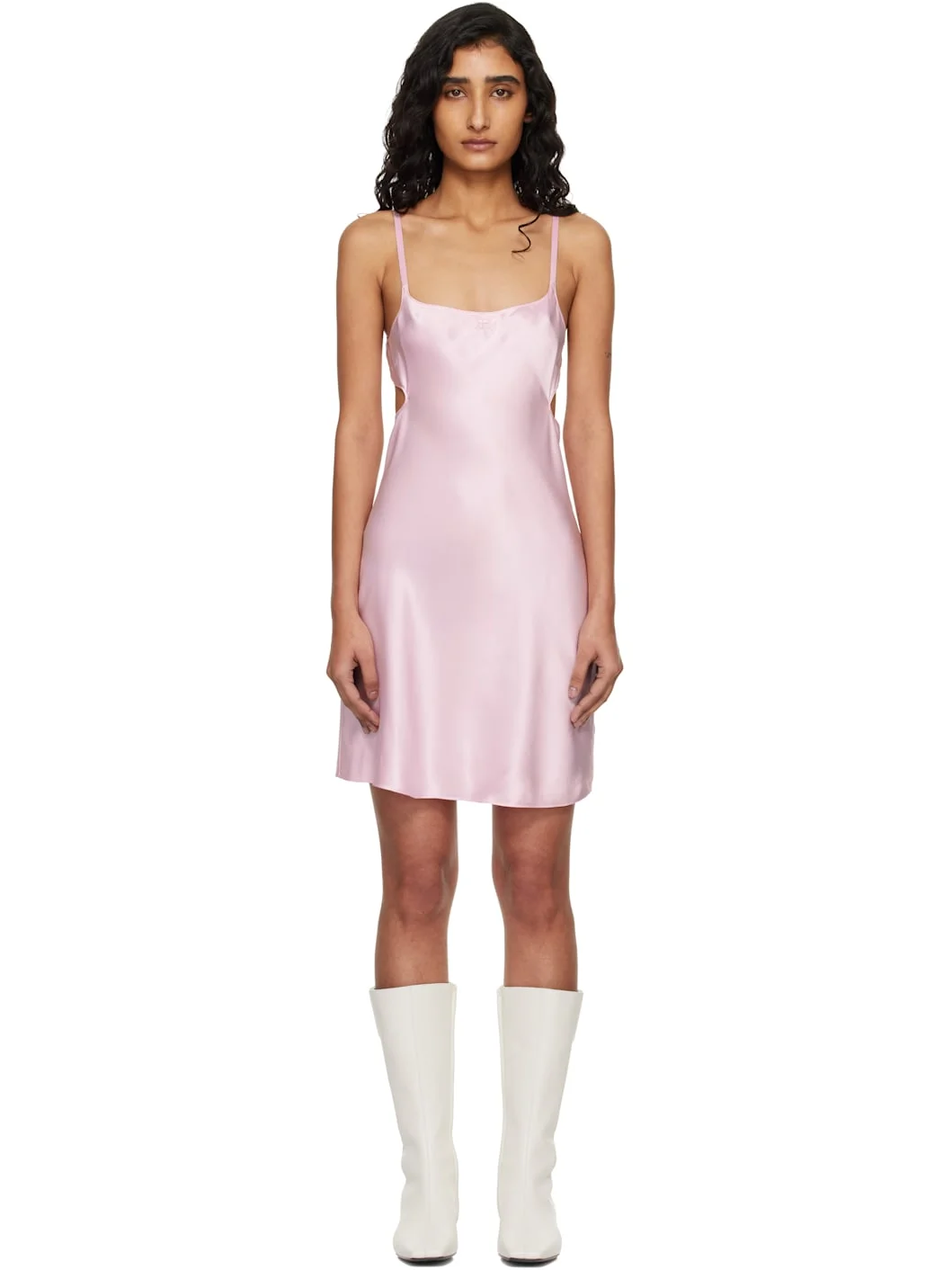 Silk satin minidress. · Scoop neck · Logo embroidered at front · Adjustable spaghetti straps · Concealed zip closure at side seam · Adjustable hook-eye fastening at back · Cutout at back Supplier color: Light pink 100% silk. Made in Madagascar 261783F052001