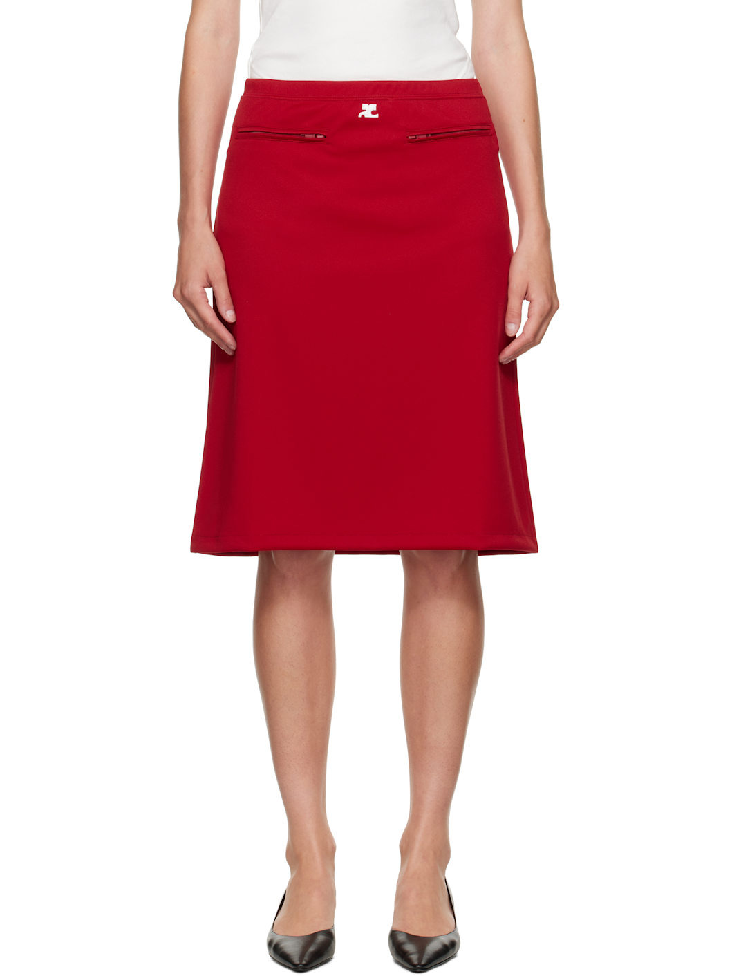 Interlock jersey midi skirt. · Elasticized waistband · Embroidered logo patch at front waist · Two-pocket styling · Darts at back waist Supplier color: Ruby 100% polyester. Made in Tunisia 252783F092007