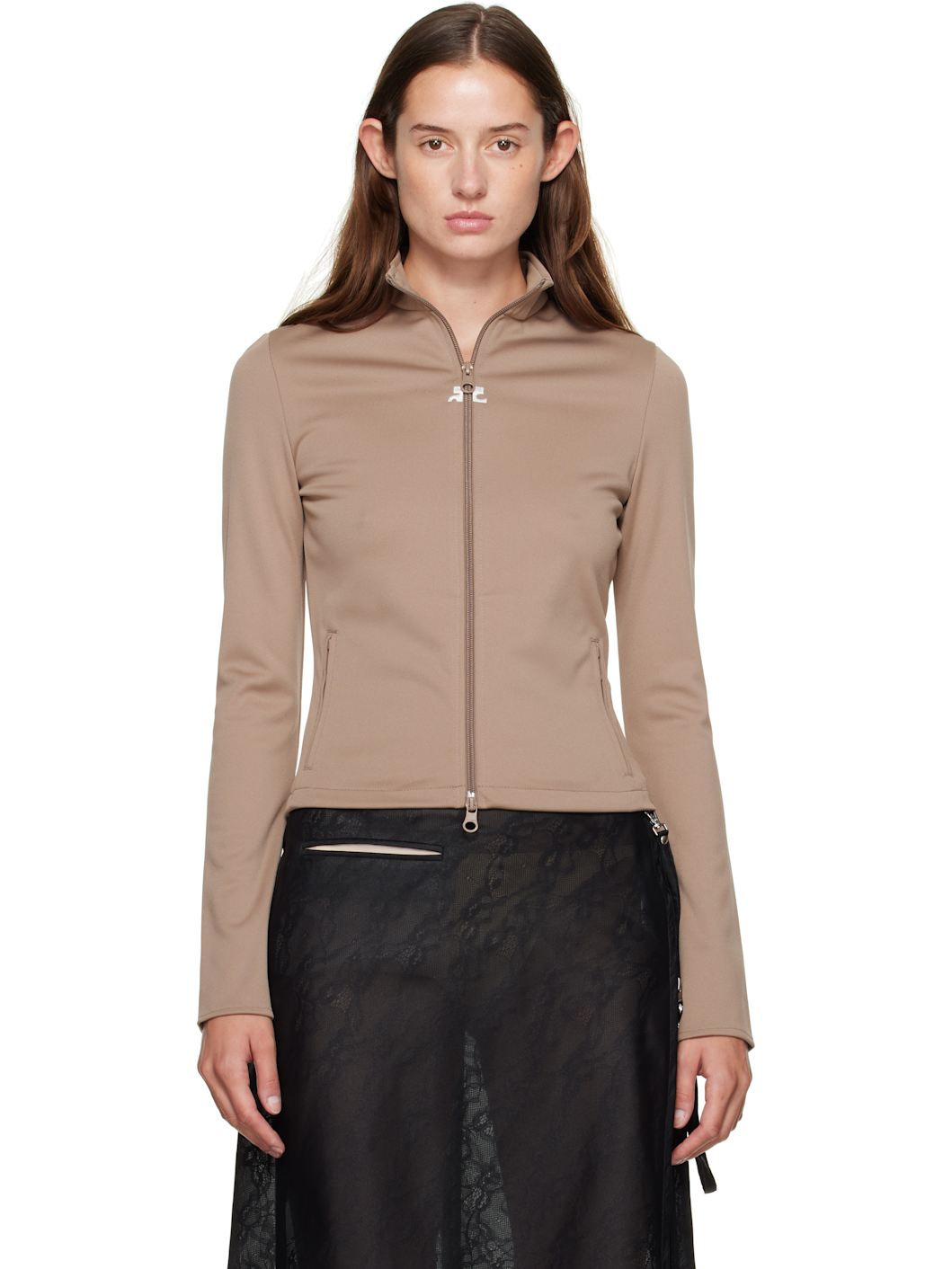 Interlock jersey track jacket. · Stand collar · Two-way zip closure · Logo embroidered at chest · Zip pockets at waist Supplier color: Mocha 100% polyester. Made in Tunisia 252783F063002