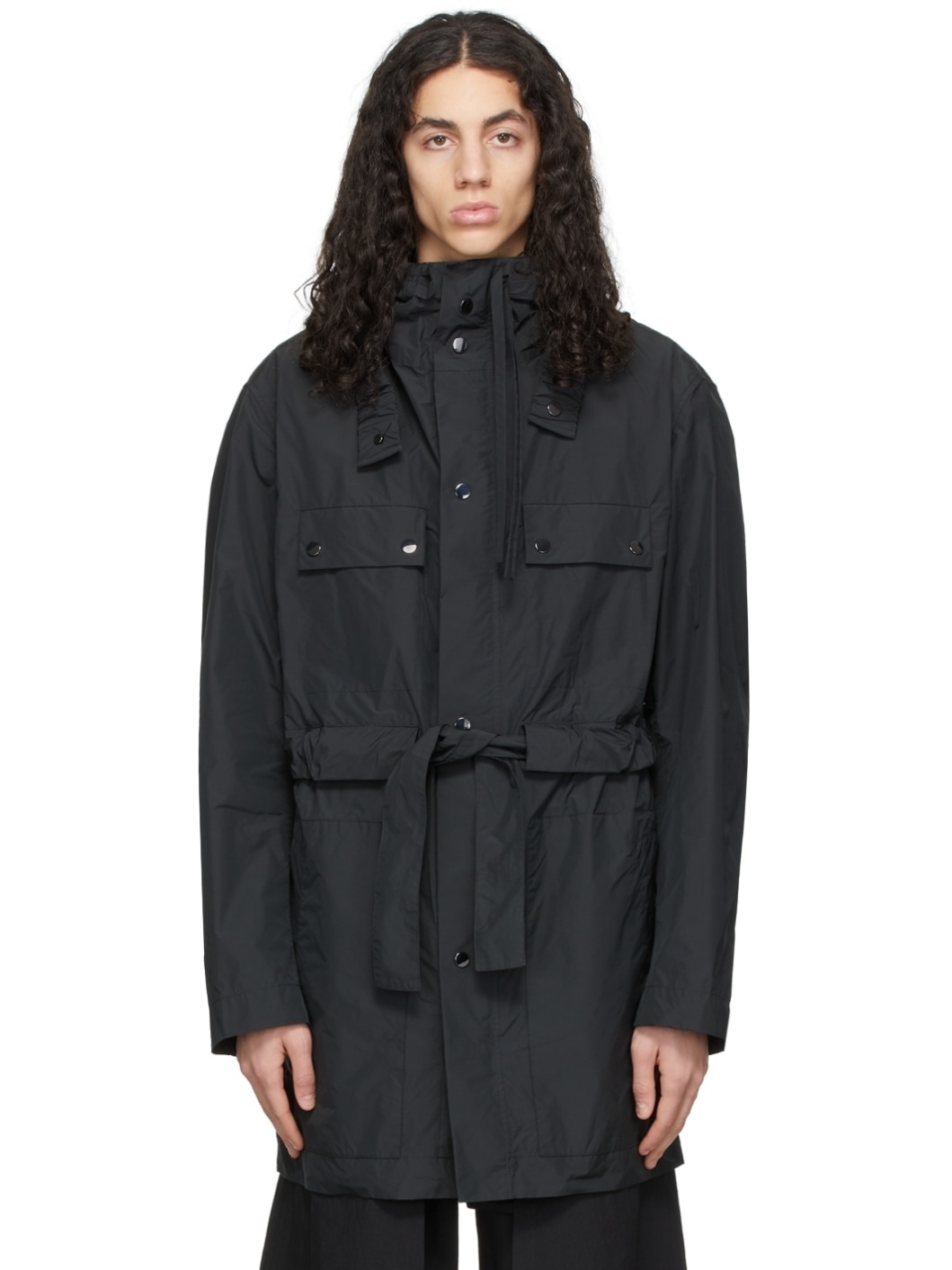 Polyester and nylon-blend sateen coat. · Drawstring at hood · Adjustable and detachable elasticized throat guard · Concealed two-way zip closure at magnetic press-stud placket · Flap pockets and concealed zip pockets · Detachable self-tie belt · Patch pockets at interior · Unlined Supplier color: Black 59% polyester, 41% nylon. Made in Italy 221735M176002