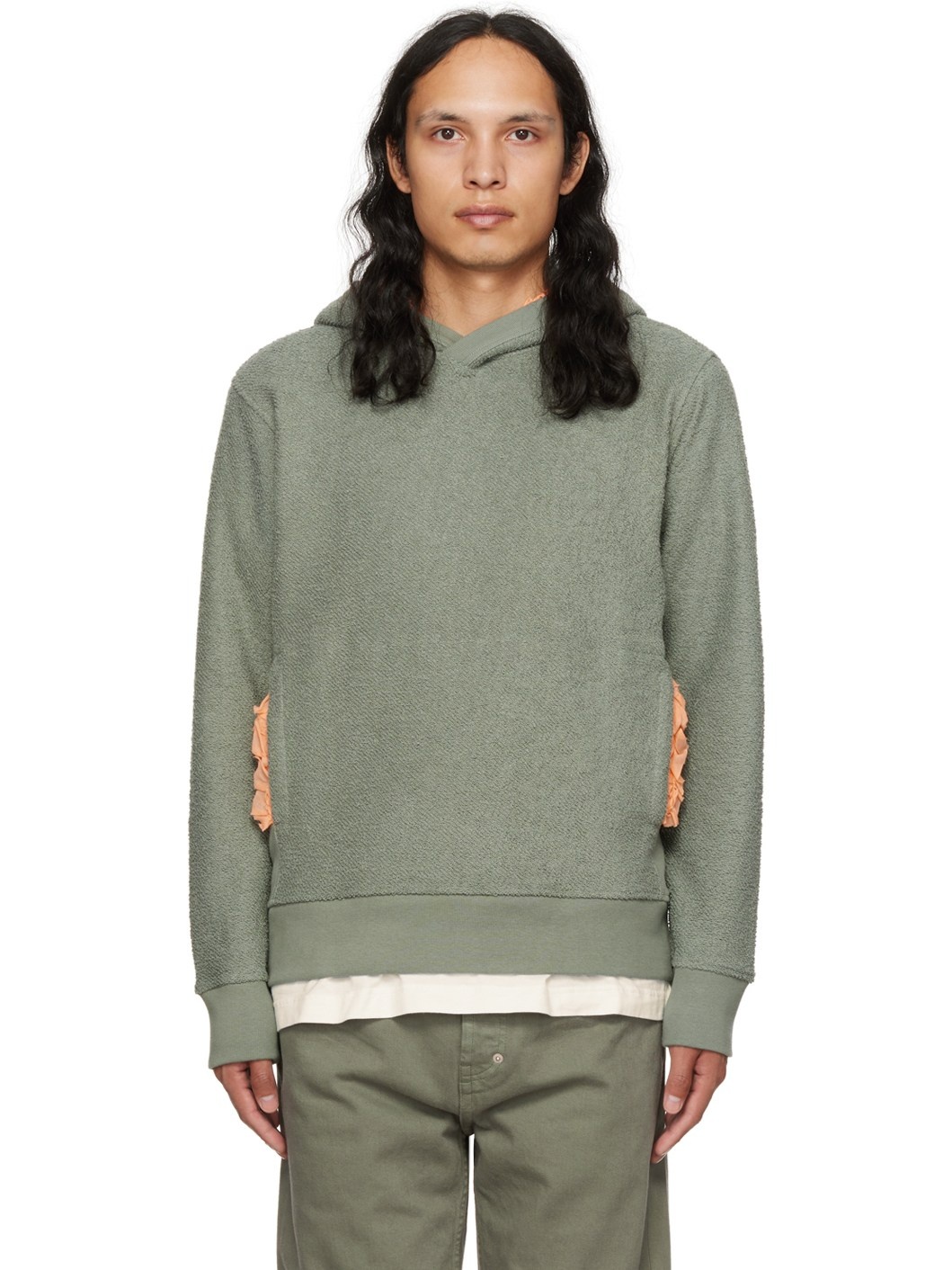 Reversed French terry hoodie. · Ruffled trim at hood and kangaroo pocket · Rib knit collar, side seams, cuffs, and hem Supplier color: Green/peach 100% cotton. Made in Italy 222735M202001