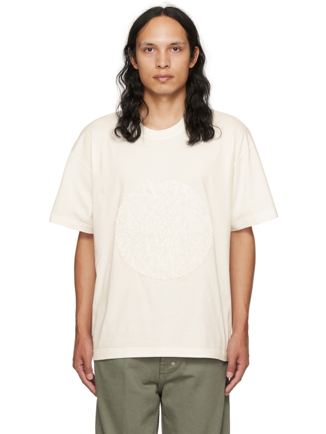 Cotton jersey T-shirt. · Rib knit crewneck · Graphic applique with loose thread detailing at front · Partial shag knit lining Supplier color: Natural Body: 100% cotton. Trim: 100% polyester. Made in Italy 222735M213000