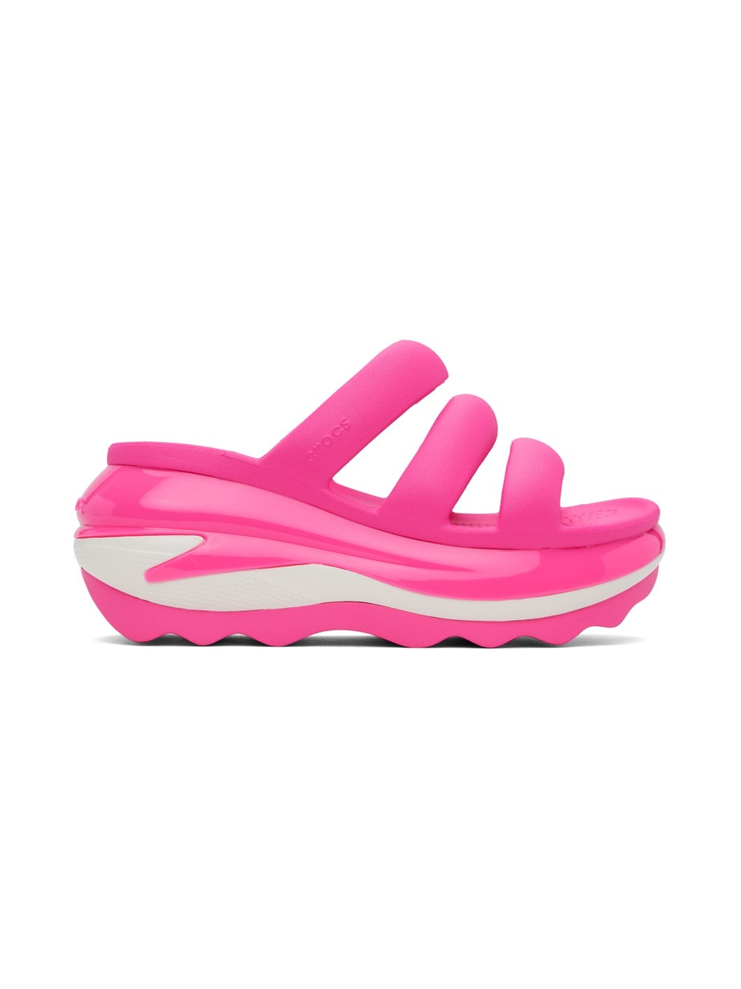 Croslite™ rubber slip-on flat sandals in pink. · Open toe · Padded straps at vamp · Logo-embossed outer side and heel · Molded rubber footbed · Sculptural platform rubber midsole · Treaded rubber sole · Platform: H3" Supplier color: Pink crush Rubber. Made in Viet Nam 242209F124003