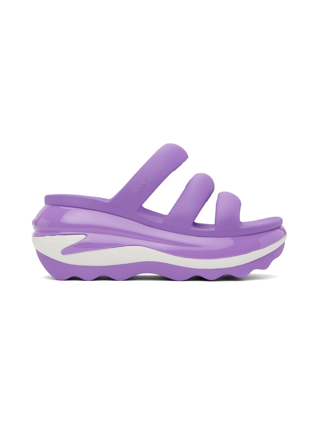 Croslite™ rubber slip-on flat sandals in purple. · Open toe · Padded straps at vamp · Logo-embossed outer side and heel · Molded rubber footbed · Sculptural platform rubber midsole · Treaded rubber sole · Platform: H3" Supplier color: Galaxy Rubber. Made in Viet Nam 242209F124004