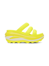 Croslite™ rubber slip-on flat sandals in yellow. · Open toe · Padded straps at vamp · Logo-embossed outer side and heel · Molded rubber footbed · Sculptural platform rubber midsole · Treaded rubber sole · Platform: H3" Supplier color: Acidity Rubber. Made in Viet Nam 242209F124002