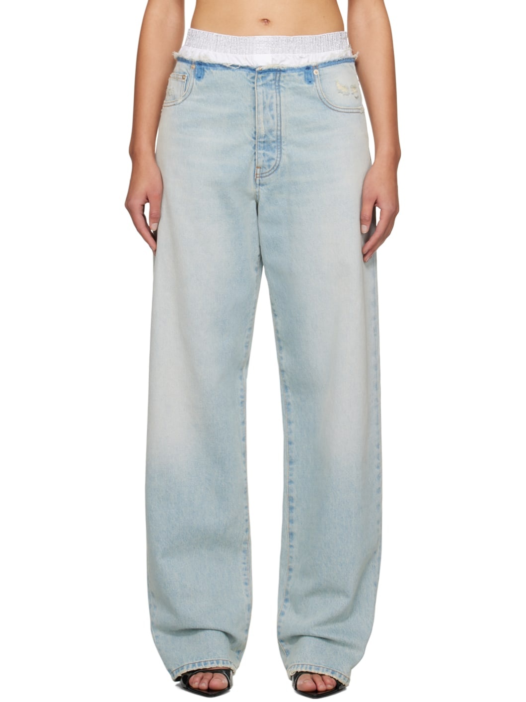 Loose-fit straight-leg non-stretch denim jeans. Fading, whiskering, and distressing throughout. · Studs at elasticized waistband · Five-pocket styling · Button-fly · Logo patch at back waistband · Partial poplin lining · Contrast stitching in orange Supplier color: Blueish white Body: 100% cotton. Lining 1: 65% polyester, 35% cotton. Lining 2: 100% cotton. Made in Italy 241589F069016