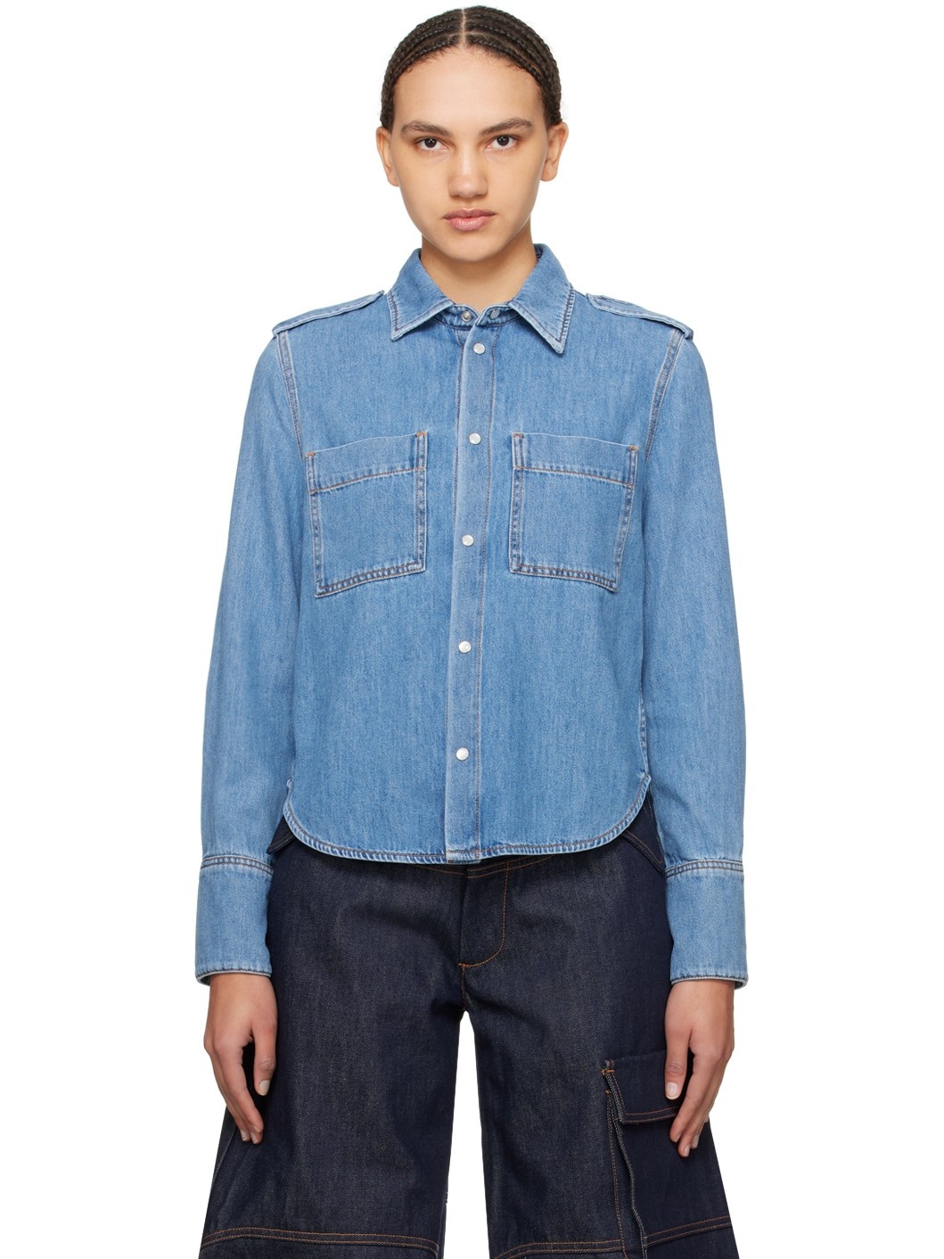 Non-stretch cotton- and tencel-blend denim shirt. Fading throughout. · Spread collar · Press-stud closure · Patch pockets · Shirttail hem · Epaulettes · Press-stud barrel cuffs · Contrast stitching in tan Supplier color: Light wash 64% cotton, 36% lyocell. Made in Italy 241589F109000