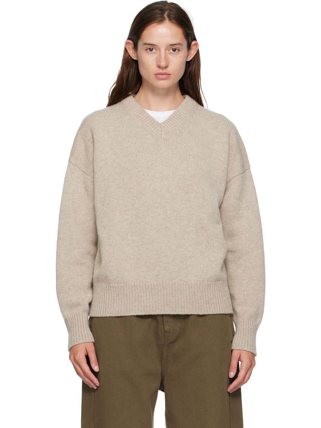 5-gauge knit virgin wool sweater. · RWS-certified virgin wool · Fully fashioned construction · Rib-knit V-neck, hem, and cuffs · Dropped shoulders Supplier color: Oat 100% virgin wool. Made in Ireland 252255F100000