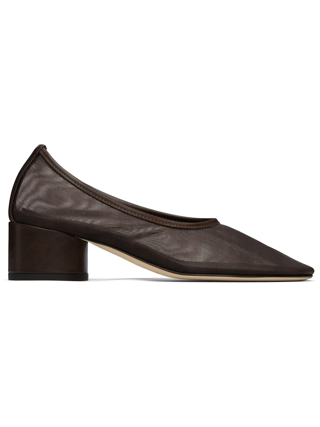 Handcrafted semi-sheer mesh heels in brown. · Grained leather trim at collar and heel · Covered block heel with rubber injection · Nubuck sole · Heel: H1.75" Supplier color: Coffee Upper: textile. Sole: leather, rubber. Made in Italy 252282F122001