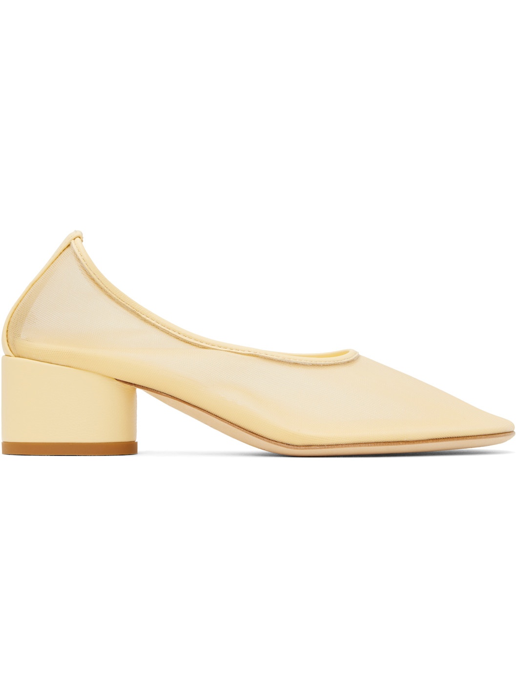 Handcrafted semi-sheer mesh heels in yellow. · Grained leather trim at collar and heel · Covered block heel with rubber injection · Nubuck sole · Heel: H1.75" Supplier color: Crema Upper: textile. Sole: leather, rubber. Made in Italy 252282F122000