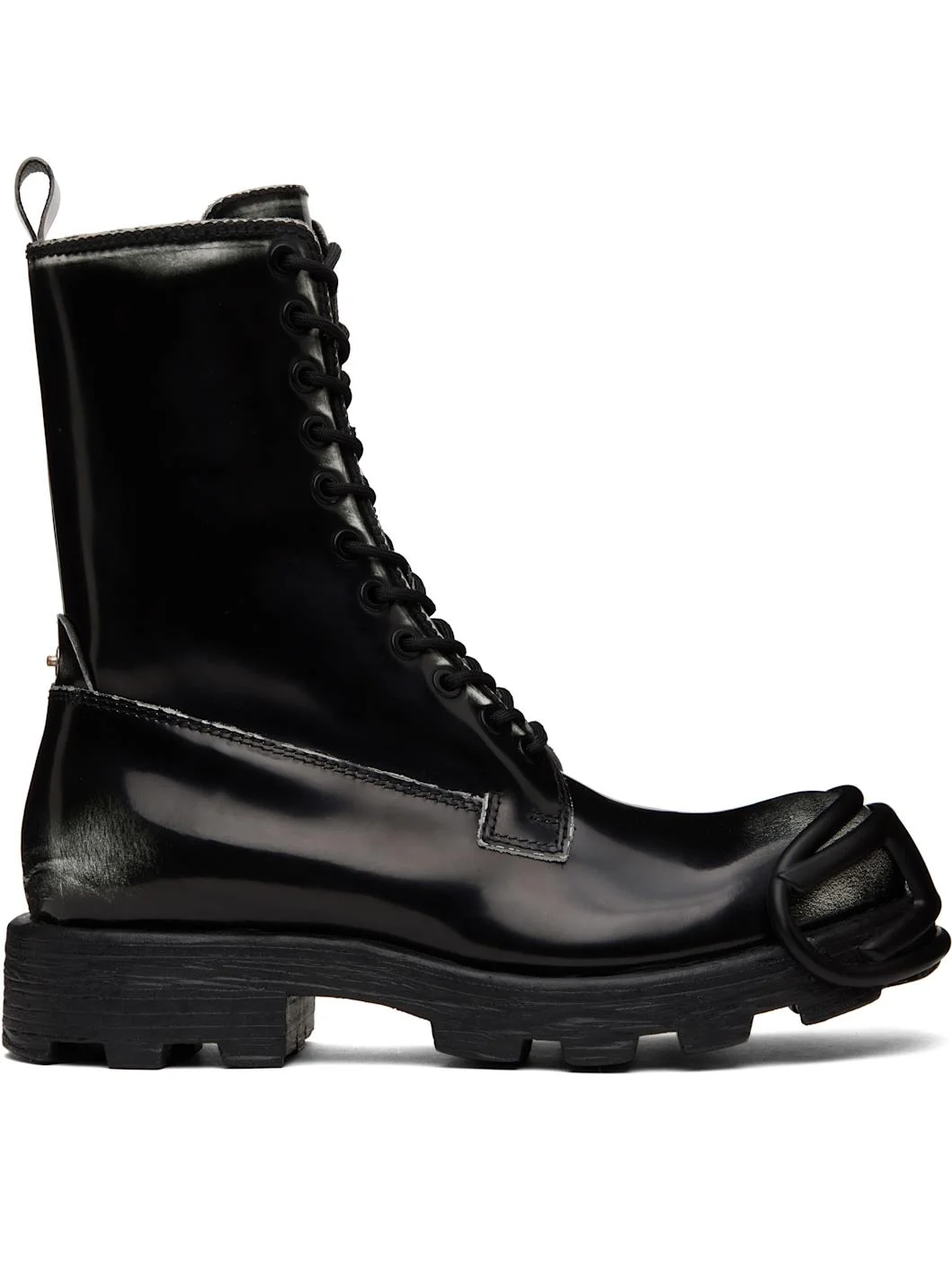Ankle-high polished leather boots. · Fading and raw edges throughout · Rubberized logo applique at toe · Lace-up closure · Zip closure at inner side · Pull-loop at heel collar · Treaded rubber sole Supplier color: Black Upper: leather. Sole: rubber. Made in Viet Nam 252001M255000