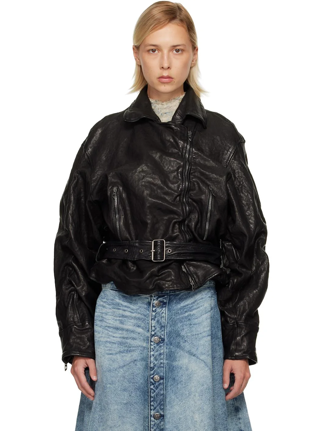 Grained oiled lambskin jacket. · Elasticized crinkling throughout · Notched lapel · Offset two-way zip closure · Zip pockets at waist · Zipped cuffs · Detachable wraparound belt at hem · Full satin lining Supplier color: Black Body: 100% lambskin. Lining: 67% viscose, 33% polyester. Made in Italy 252001F064003
