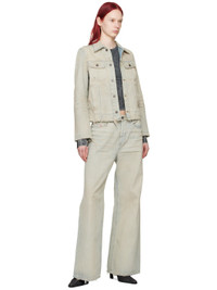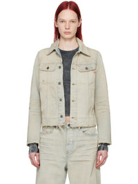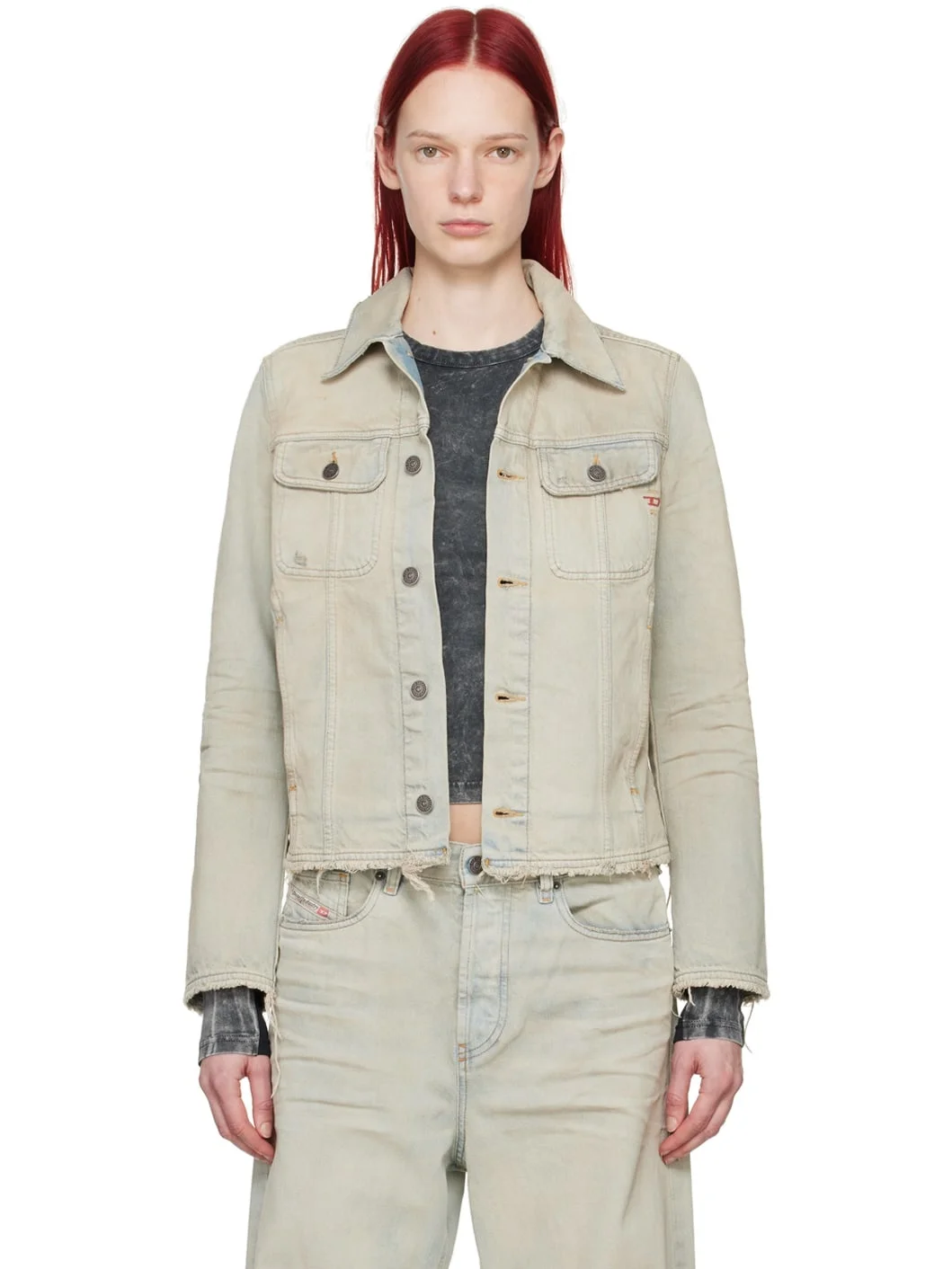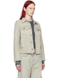 Non-stretch denim jacket. Fading, whiskering, and subtle distressing throughout. · Paneled construction · Spread collar · Button closure · Logo embroidered at chest · Flap and welt pockets · Frayed edge at hem and cuffs · Logo-engraved gunmetal-tone hardware · Contrast stitching in yellow Supplier color: Light blue