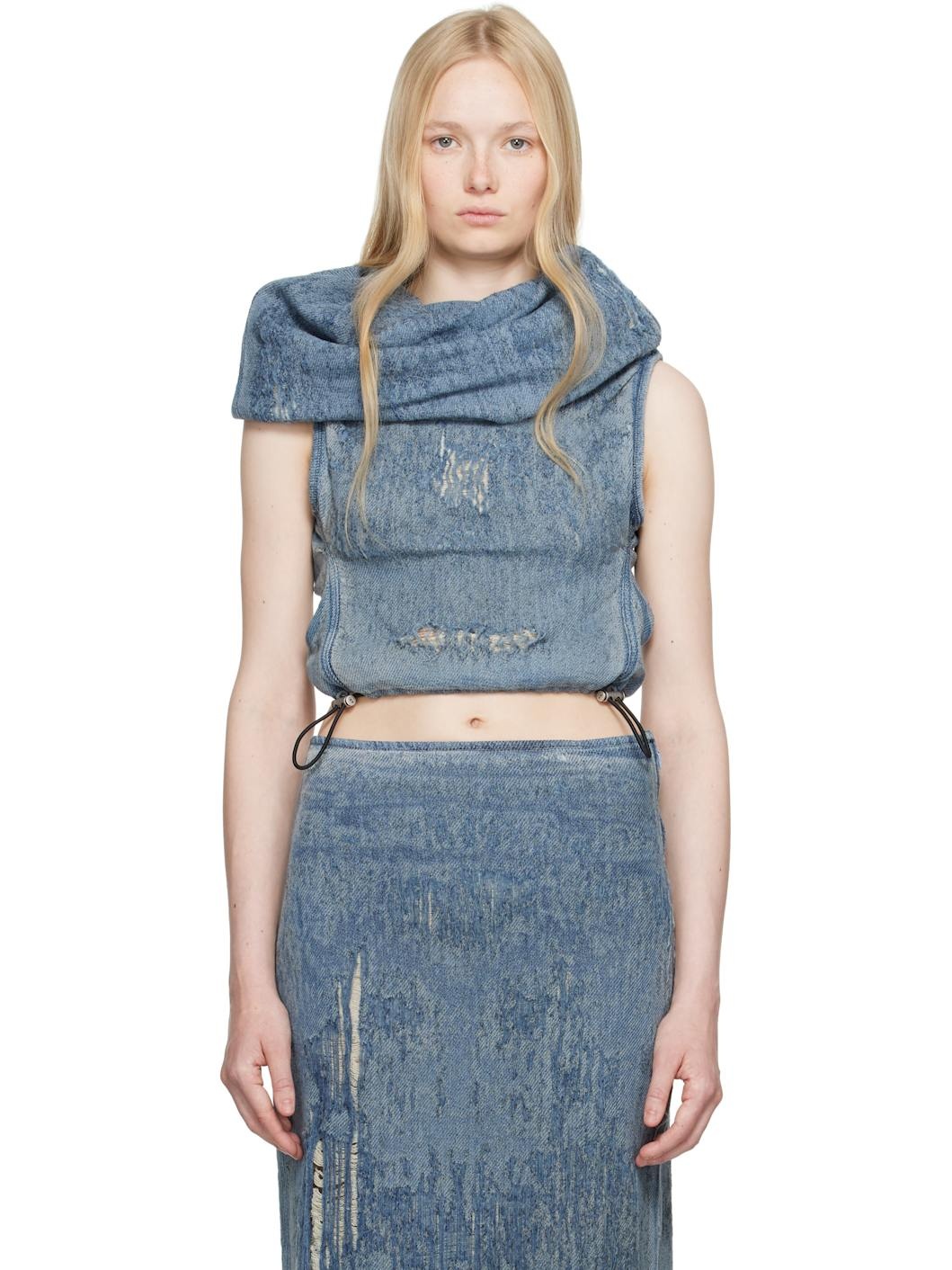 Stretch denim top. Fading and distressing throughout. · Hood at cowl neck · Bungee-style drawstring at hem · Full stretch nylon mesh lining Supplier color: Medium blue Body: 89% cotton, 10% polyester, 1% elastane. Lining: 80% nylon, 20% elastane. Made in Tunisia 251001F107002