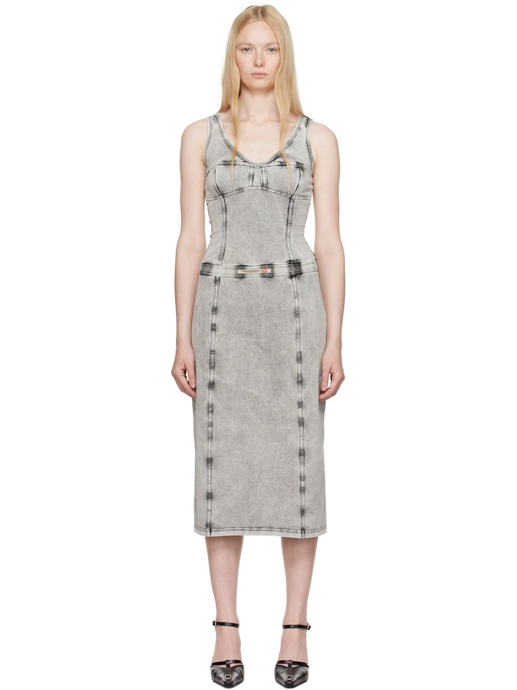 Stretch cotton jersey midi dress. Trompe l'œil denim pattern printed throughout. · Paneled construction · Scoop neck · Logo patch at elasticized waistband Supplier color: Grey 95% cotton, 5% elastane. Made in India 251001F054007