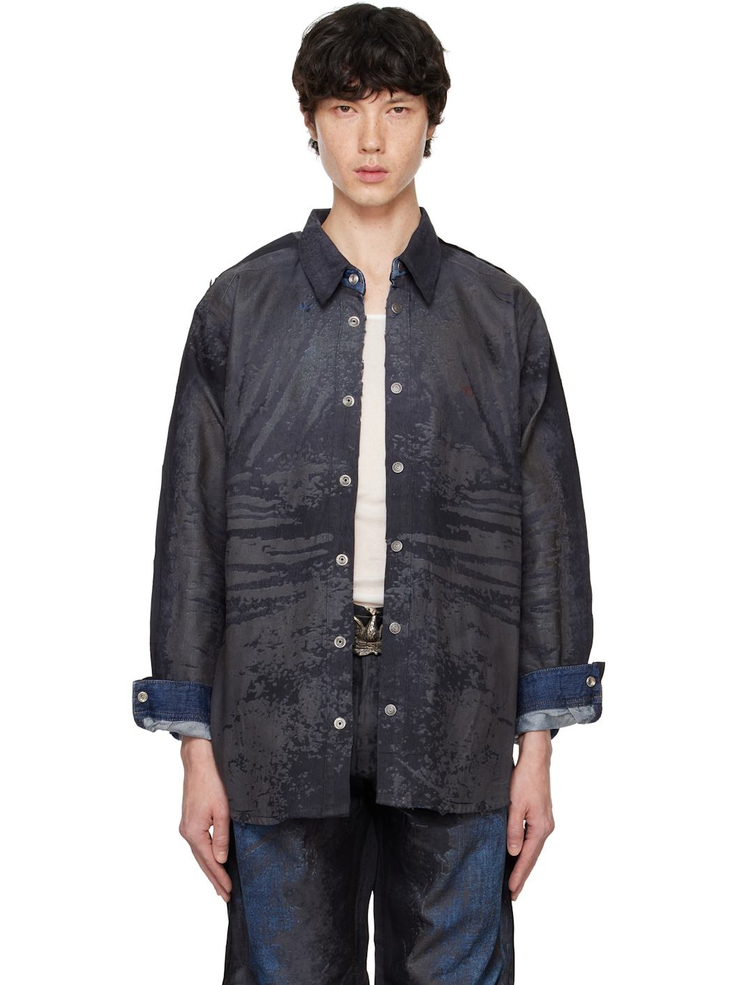 Coated non-stretch lyocell denim shirt. Fading and whiskering throughout. · Spread collar · Press-stud closure · Logo embroidered at chest · Shirttail hem · Raw edge at side seams and sleeves · Single-press-stud barrel cuffs · Logo-engraved silver-tone hardware Supplier color: Denim Body: 100% lyocell. Trim: 100% cotton. Made in Tunisia 242001M192001