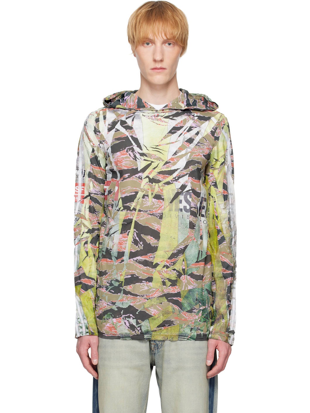 Cracked coated stretch nylon jersey hoodie. · Graphic pattern printed throughout · Logo graphic printed at chest and back Each item is unique. Please note patterning may vary. Supplier color: Brown/Green 88% nylon, 12% elastane. Made in Bulgaria 251001M202013