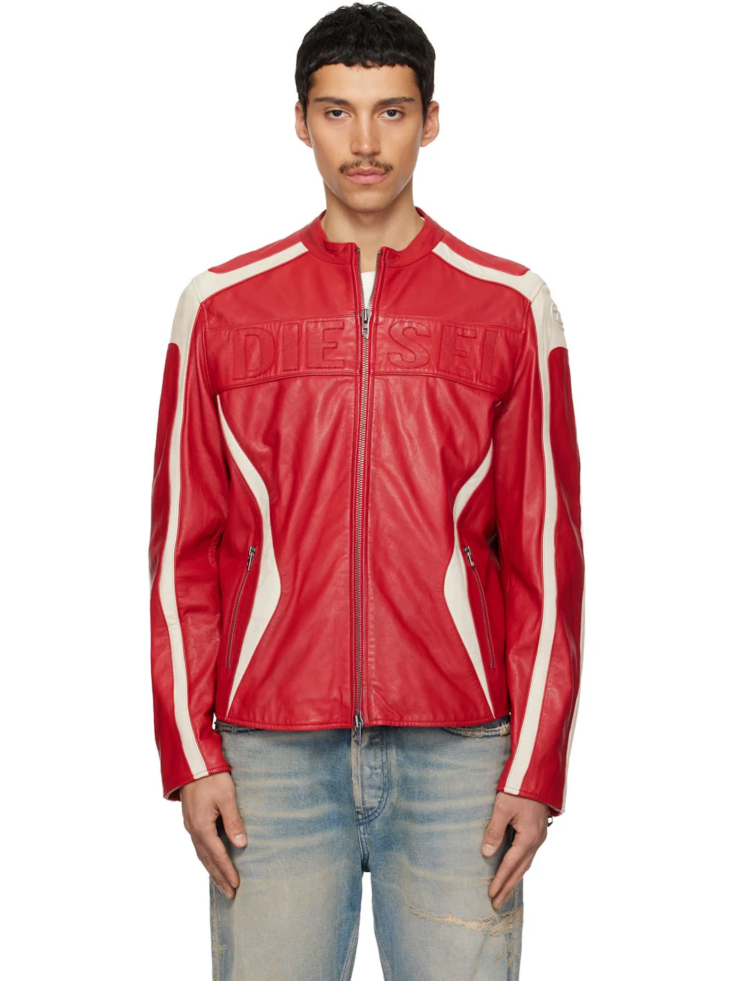 Grained goatskin jacket. · Paneled construction · Band collar · Zip closure · Logo patches at chest · Zip pockets at front · Logo embossed at sleeve · Zip expansion panel at cuffs · Welt pocket at interior · Full logo-woven satin lining Supplier color: Red/White Body: 100% goatskin. Lining: 65% viscose, 35% polyester. Made in India 261001M181001