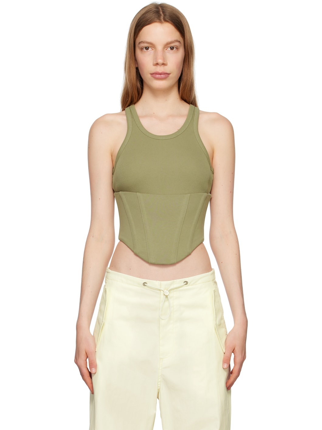 Rib knit stretch organic cotton tank top. · Layered construction · Crewneck · Boning at front · Asymmetric hem · Zip closure at back Supplier color: Sage Body 1: 100% organic cotton. Body 2: 98% organic cotton, 2% elastane. Made in Portugal 232417F111015