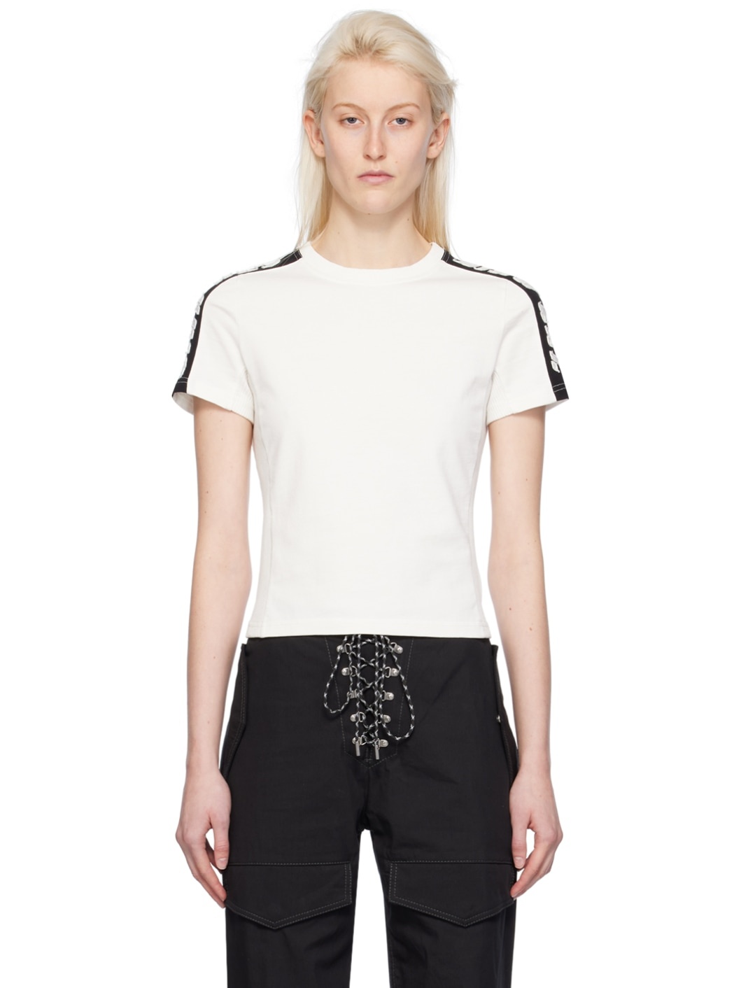 Organic cotton jersey T-shirt. · Paneled construction · Rib knit crewneck, side seams, and armscyes · Raw edge logo appliques at shoulders Supplier color: Ivory/Black 100% organic cotton. Made in Portugal 241417F110000