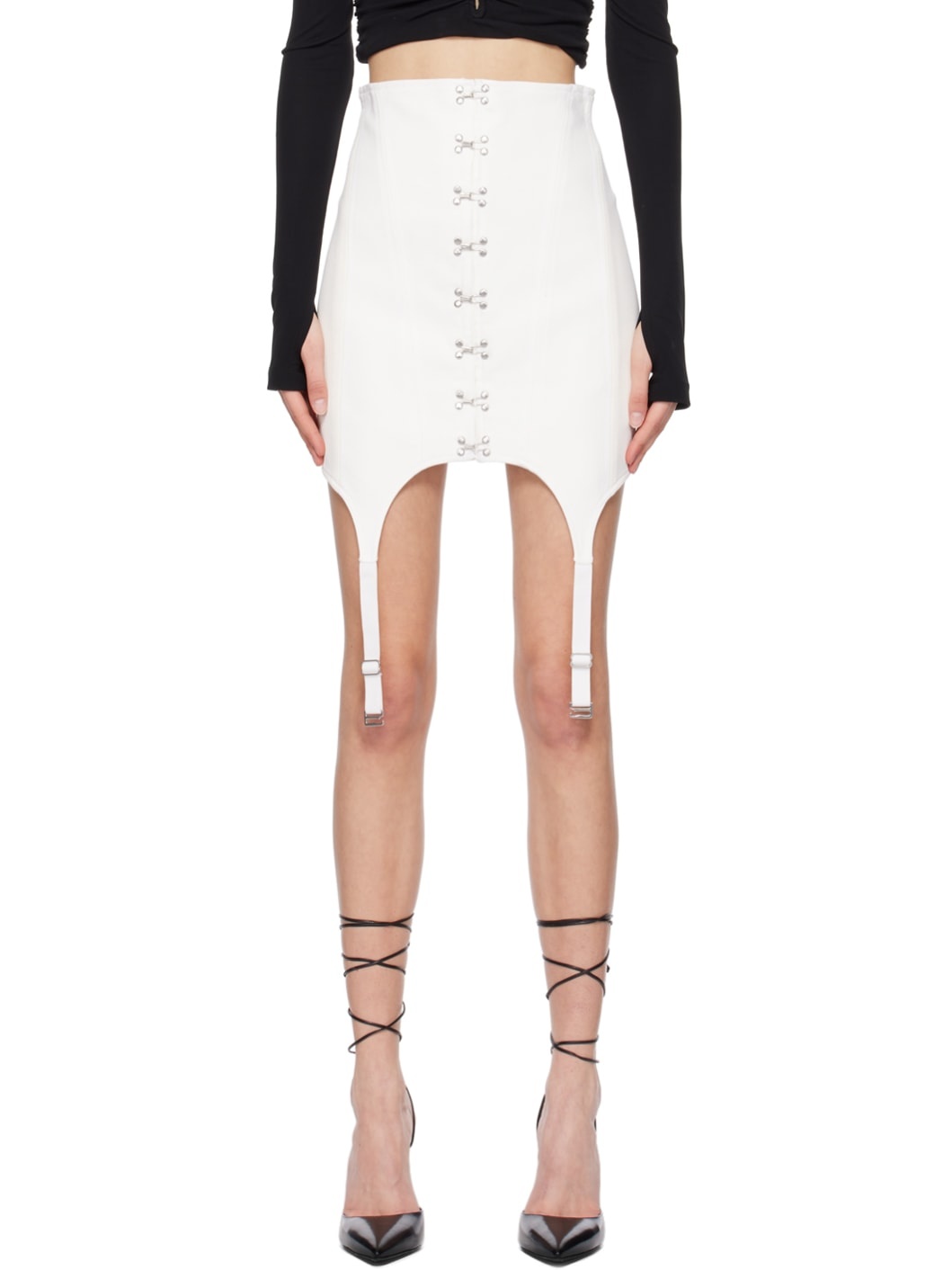 Knit stretch viscose-blend and stretch organic cotton drill skirt. · Paneled construction · Hook-eye closure at front · Adjustable elasticized garter straps at hem Supplier color: Ivory Body 1: 98% organic cotton, 2% elastane. Body 2: 84% viscose, 12% nylon, 4% elastane. Made in Poland 231417F090014