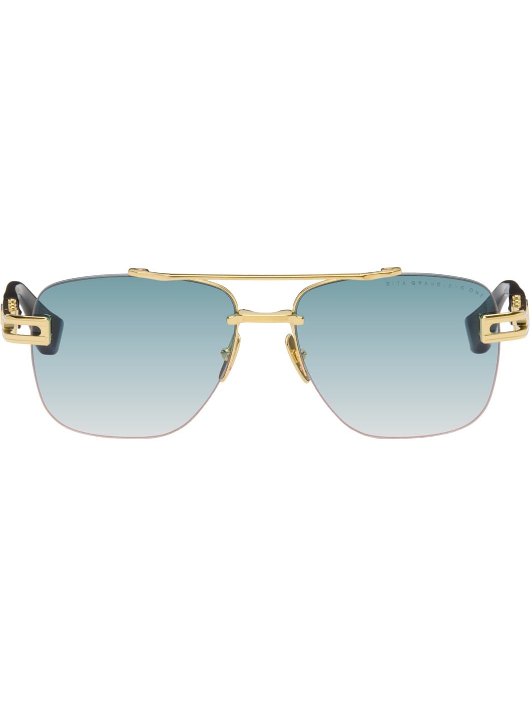 Handcrafted and aviator-style rimless titanium- and acetate-frame sunglasses. · Anti-reflective CR-39 blue lenses · Logo etched at lens · 100% UVA/UVB protection · Top bar · Adjustable metal nose pads · Fluted detailing at temples · Inset logo at temple tip · Includes case · Size: 57.16 145 Available exclusively at SSENSE. Supplier color: Black/Gold Titanium, acetate. Made in Japan 252789M134035