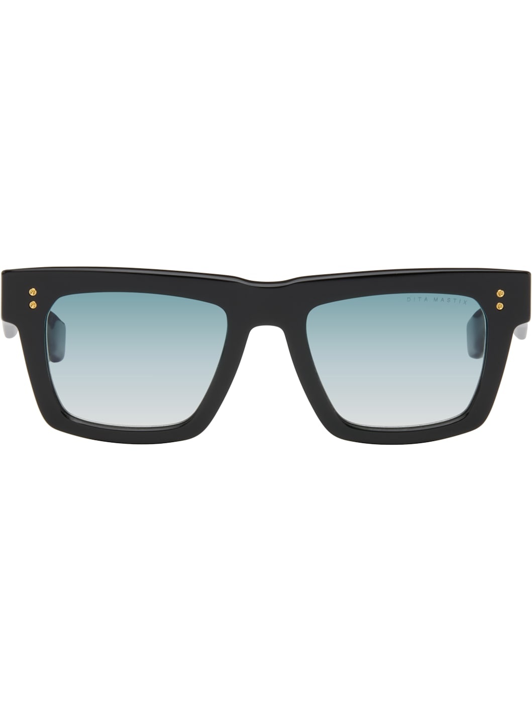 Handcrafted square acetate-frame sunglasses. · Anti-reflective CR-39 blue lenses · Logo etched at lens · 100% UVA/UVB protection · Integrated nose pads · Rivets at face and temples · Inset logo at temple tips · Includes case · Size: 54.21 148 Available exclusively at SSENSE. Supplier color: Black/Gold Acetate. Made in Japan 252789M134040