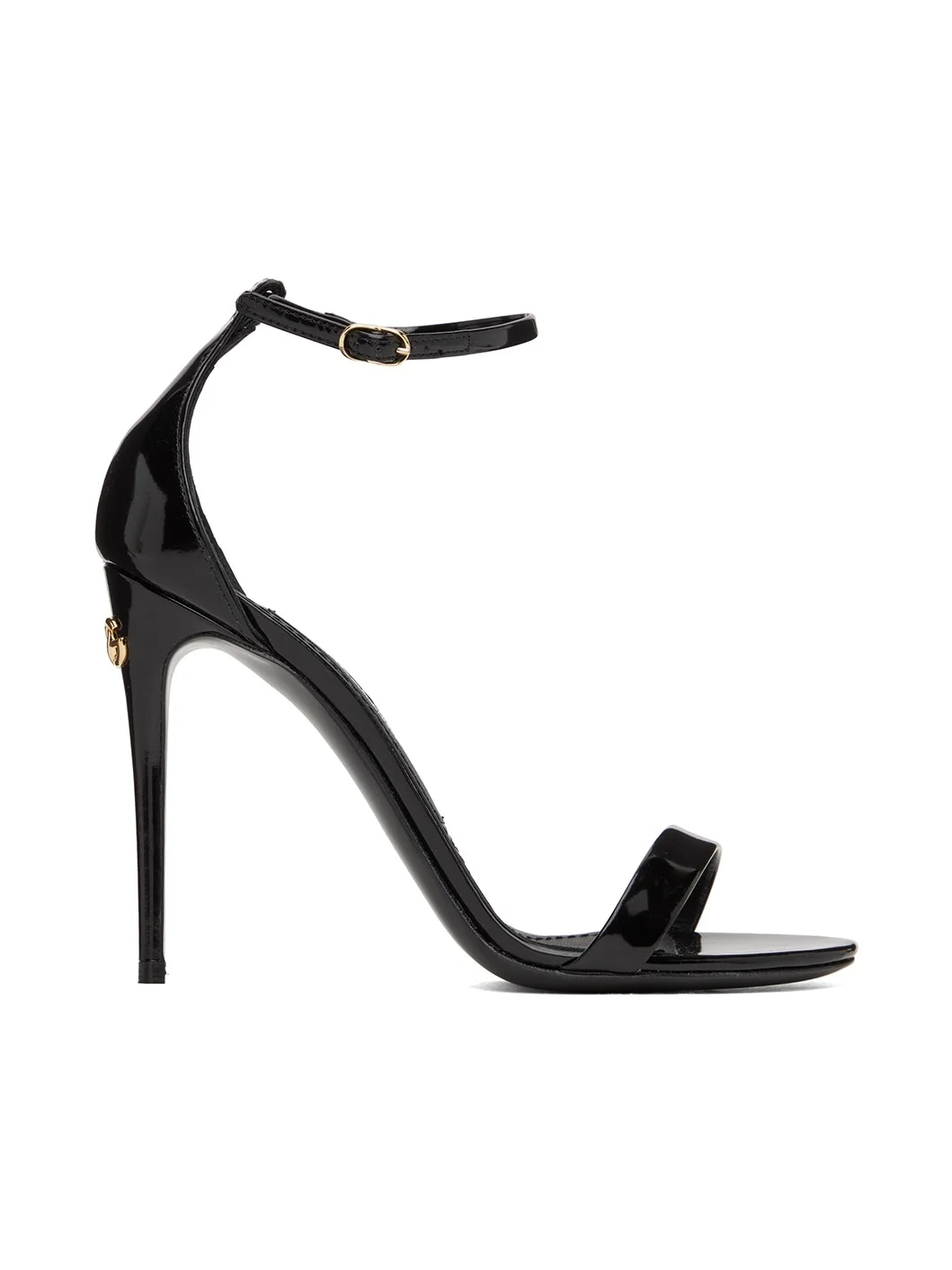 Polished calfskin heeled sandals in black. · Open almond toe · Pin-buckle ankle strap · Logo patch at goatskin footbed · Logo hardware at covered stiletto heel · Laminated leather sole · Heel: H4 in Supplier color: Nero