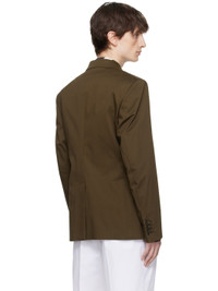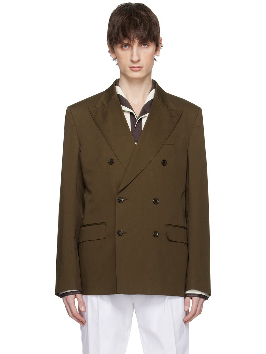 Stretch polyester- and wool-blend gabardine blazer. · Peaked lapel · Double-breasted button closure · Welt pocket and flap pockets · Darts at front · Surgeon's cuffs · Central vent at back hem · Welt pockets at interior · Full satin lining Supplier color: Testa di moro 54% polyester, 44% wool, 2% spandex. Made in Italy 251003M195003