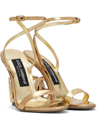 Patent leather heeled sandals in gold tone. - Open toe - Wraparound pin-buckle ankle strap - Logo patch at leather footbed - Logo hardware at modified wedge heel - Rubber injection at heel - Leather sole - Heel: H4 Supplier color: Oro
