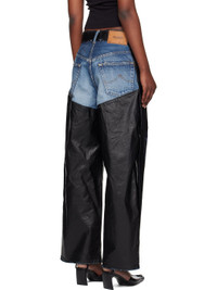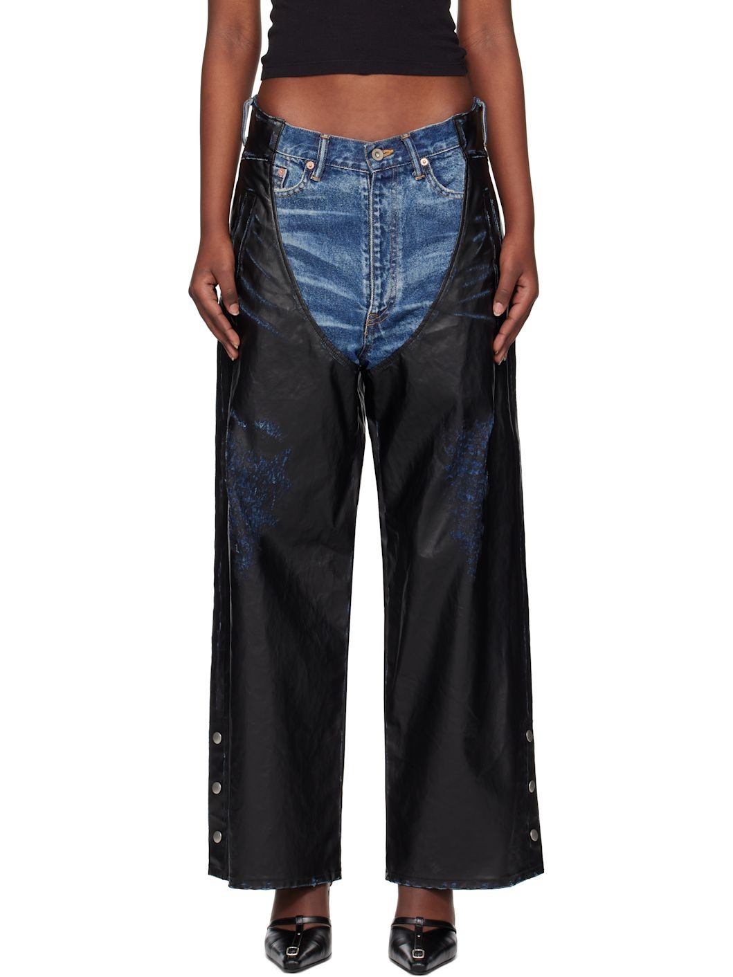 Blue & Black Faux-Leather Coating Chaps Jeans
