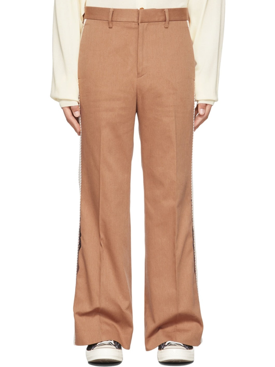 Flared cotton twill trousers in brown featuring embroidered trim detailing in white, beige, and brown at outseams. · Mid-rise · Four-pocket styling · Belt loops at waistband · Zip-fly · Partially lined This item is part of a limited run of 50. Supplier color: Brown Body: 100% cotton. Lining: 100% cupra. Made in Japan 221038M190001