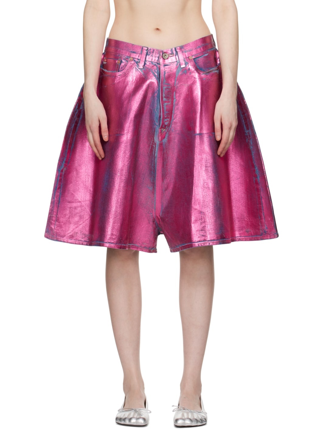 Indigo-dyed metallic foil-coated stretch denim shorts. Metallic thread detailing throughout. · Belt loops · Five-pocket styling · Button-fly · Leather logo patch at back waistband · Logo flag at back · Logo-engraved antiqued silver-tone hardware Supplier color: Pink 67% cotton, 22% rayon, 11% polyester. Made in Japan 241038F088001