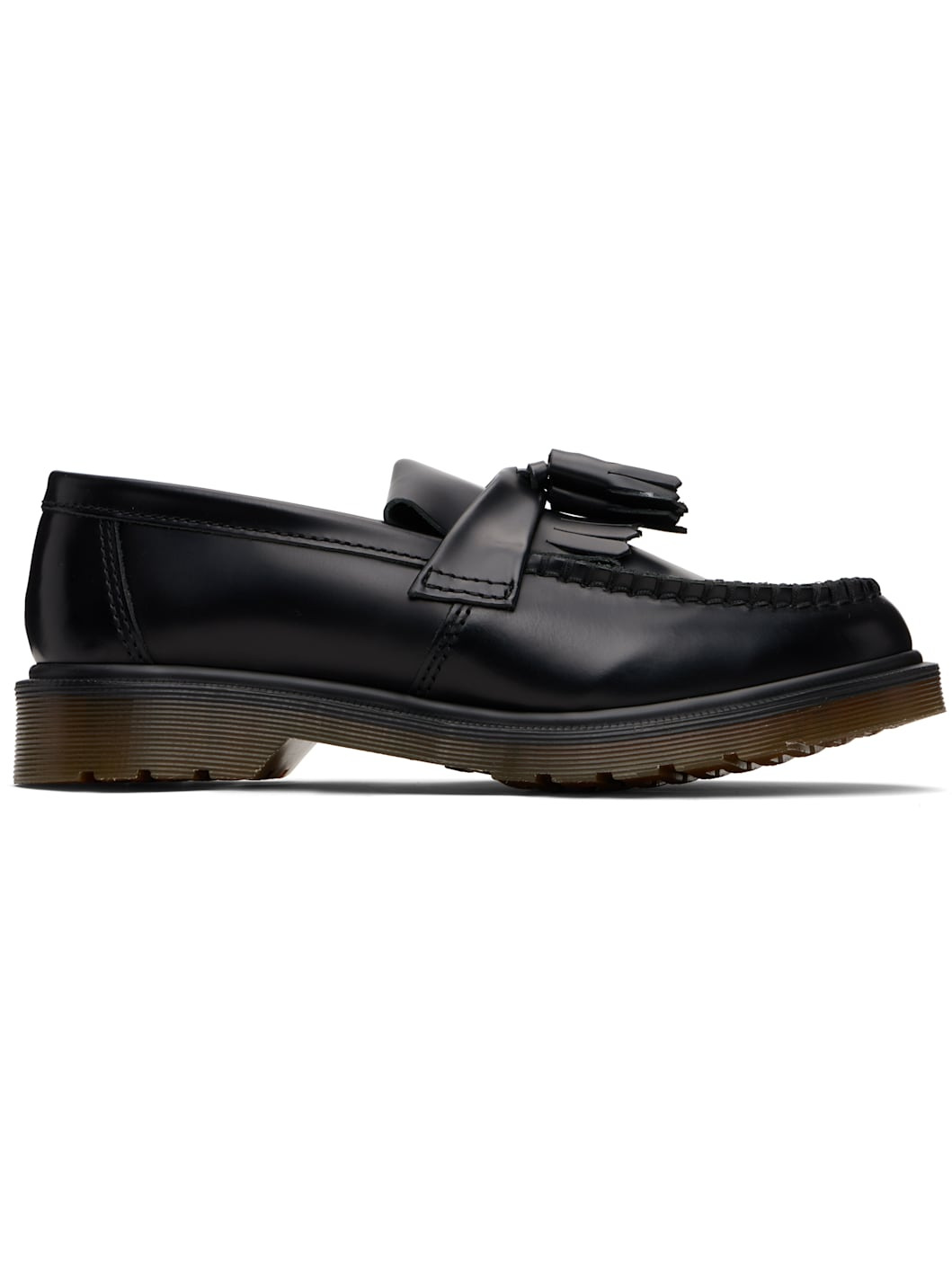 Polished leather loafers. · Blanket stitching at moc toe · Tassels and fringed detailing at vamp · Suede lining · Serrated detailing at heat-sealed Goodyear welt · Treaded Air Cushion rubber sole · Heel: H1.25" Supplier color: Black polished smooth Upper: leather. Sole: rubber. Made in Viet Nam 252399M231015