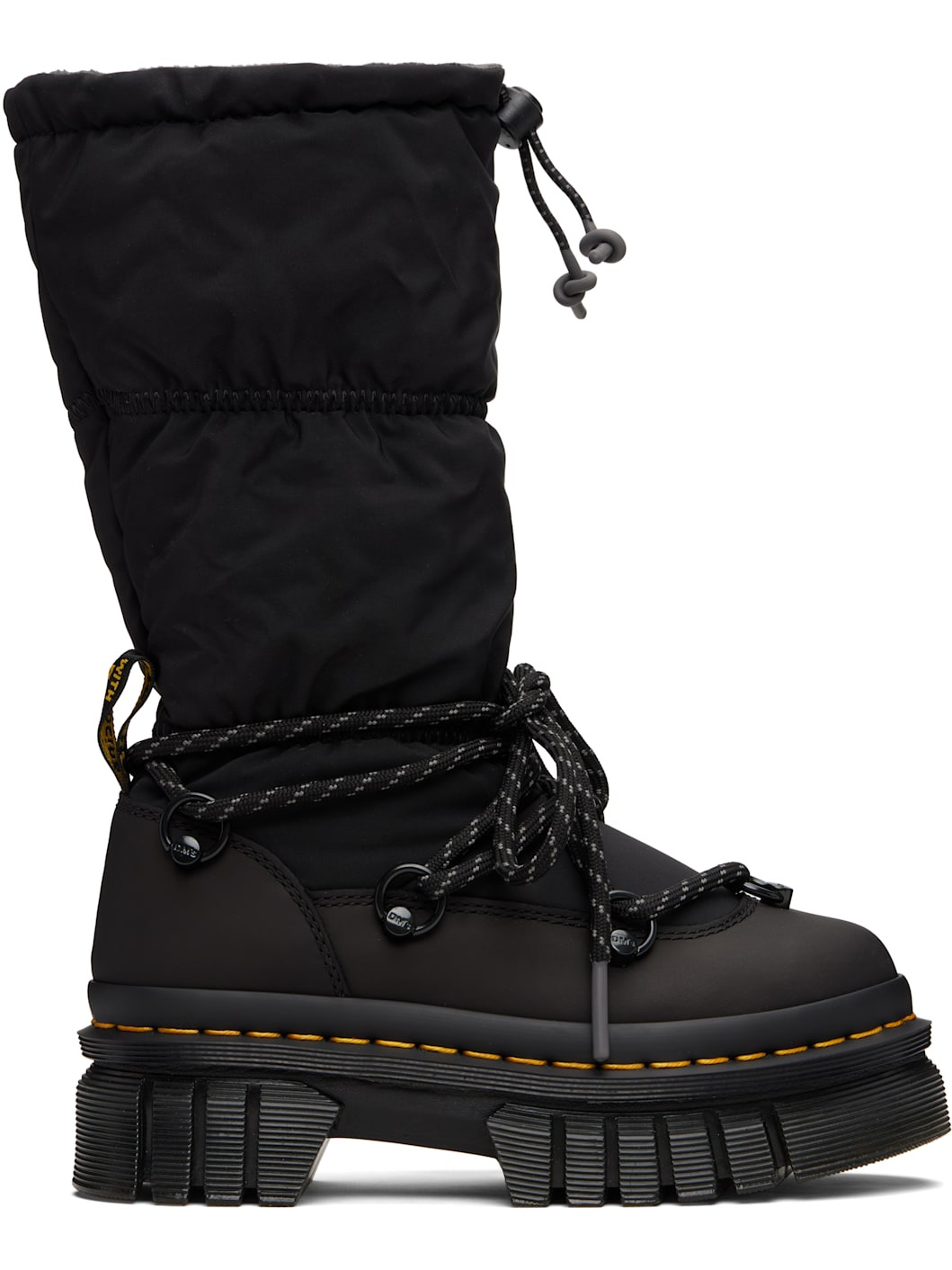 Mid-calf padded taffeta and buffed leather boots. · Lace-up closure · Cord-lock drawstring at elasticized collar · Pull-loop at heel counter · Fleece lining · Yellow topstitching at heat-sealed Goodyear welt · Treaded Air Cushion rubber platform sole · Platform: H1.75" Supplier color: Black Upper: textile, leather. Sole: rubber. Made in Viet Nam 252399F115006