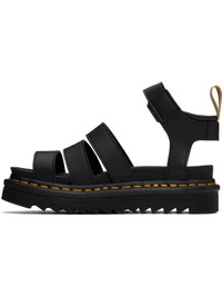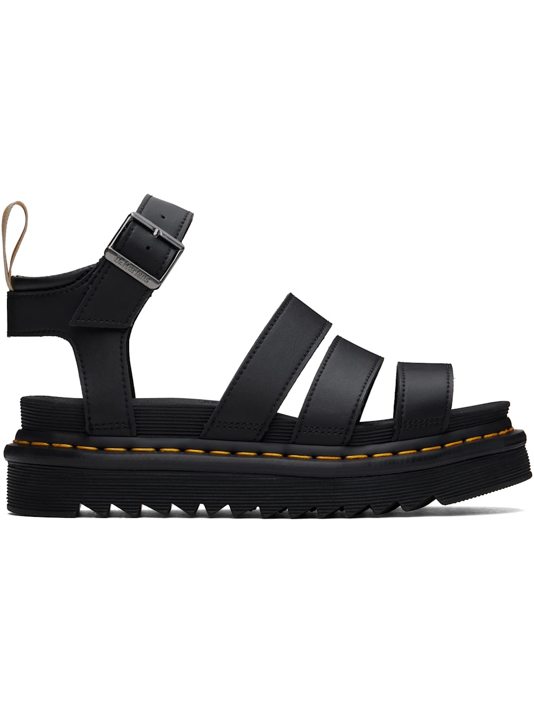 Buffed faux-leather flat sandals in black. · Open toe · Straps at vamp · Pin-buckle ankle strap · Logo-woven pull-loop at heel · Yellow topstitching at heat-sealed Goodyear welt · Logo-embossed molded foam rubber footbed · Treaded foam rubber sole · Logo-engraved gunmetal-tone hardware Supplier color: Black Upper: synthetic. Sole: rubber. Made in China 251399F124000