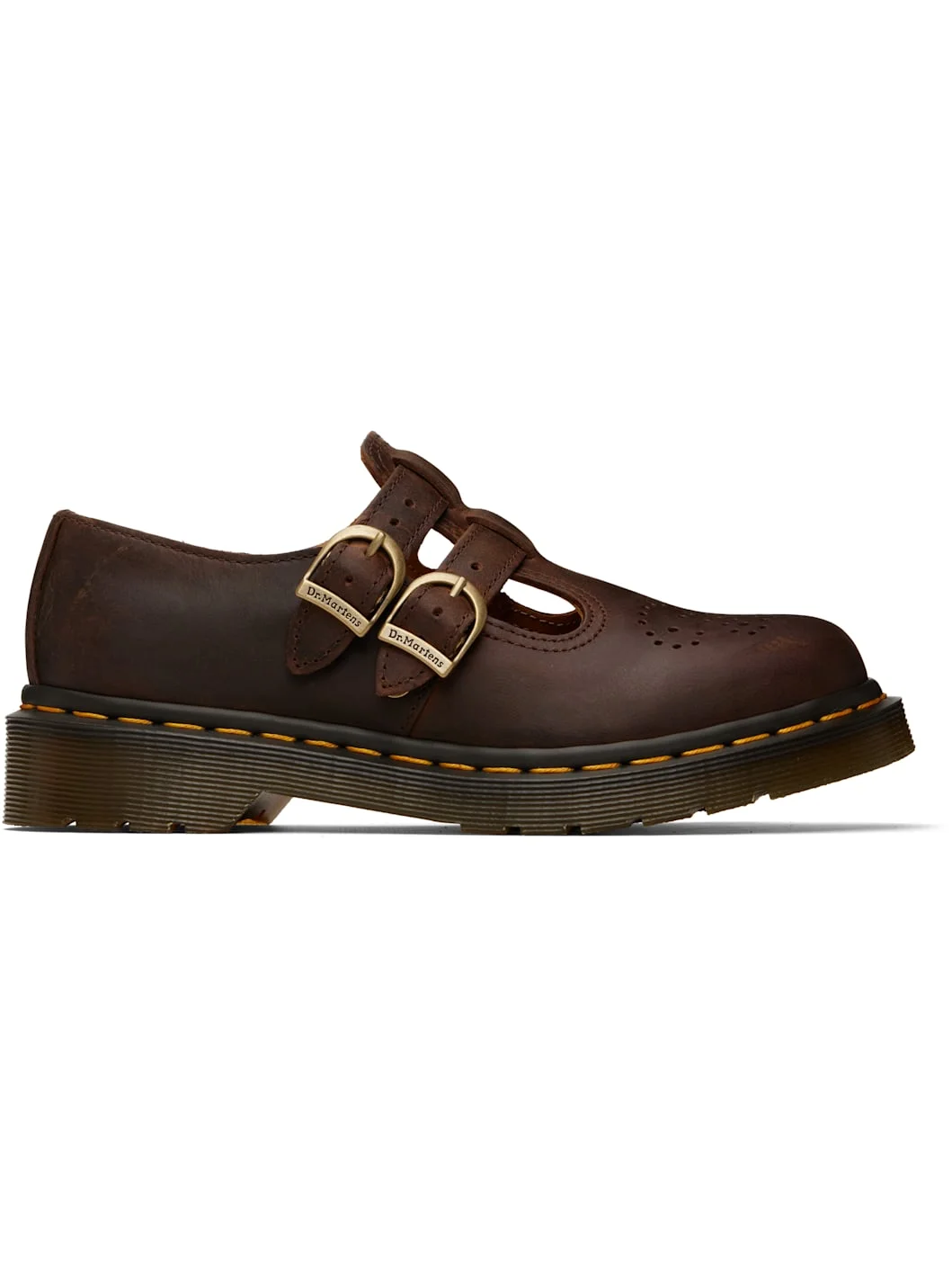 Buffed leather Mary Jane-style loafers. · Smudging throughout · Perforations at vamp · Pin-buckle straps at vamp · Buffed leather lining · Yellow topstitching at heat-sealed Goodyear welt · Treaded Air Cushion rubber sole Supplier color: Dark Brown/Crazy Horse Upper: leather. Sole: rubber. Made in Viet Nam 261399F120020