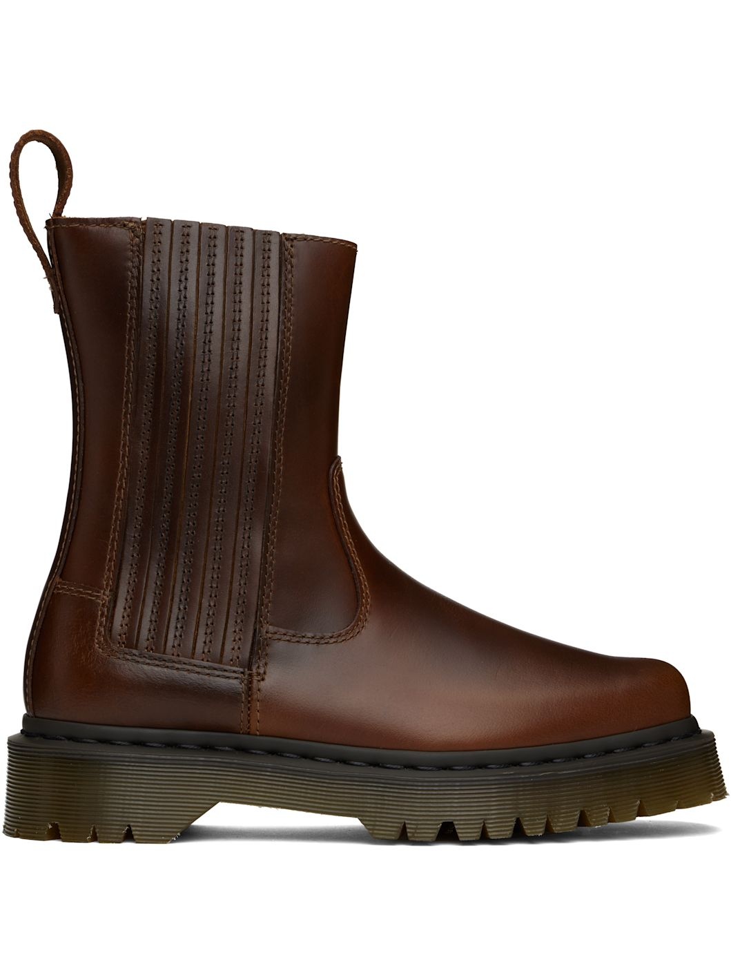 Mid-calf buffed leather Chelsea boots in brown. · Square toe · Elasticized gusset at outer side · Zip closure at inner side · Pull-loop at heel collar · Buffed leather lining · Yellow topstitching at heat-sealed Goodyear welt · Treaded Air Cushion rubber sole · Logo-engraved antiqued gold-tone hardware Supplier color: Butterscotch Orleans Upper: leather. Sole: rubber. Made in Viet Nam 251399F114000
