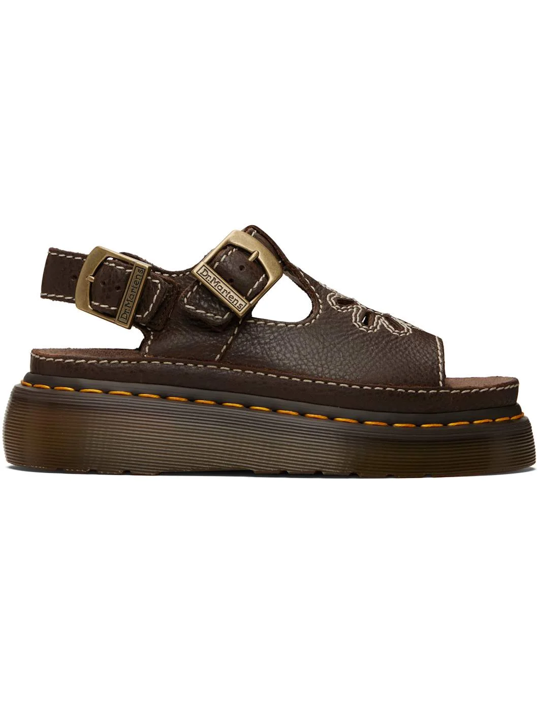 Grained leather sandals. · Open toe · Graphic cutouts at vamp · Pin-buckle strap and cutouts at vamp · Pin-buckle slingback strap · Suede lining · Yellow topstitching at heat-sealed Goodyear welt · Treaded Air Cushion rubber platform sole · Contrast stitching at white · Platform: H1.5" Supplier color: Brown/AR Rogue Upper: leather. Sole: rubber. Made in Lao Peoples Republic 261399F124006