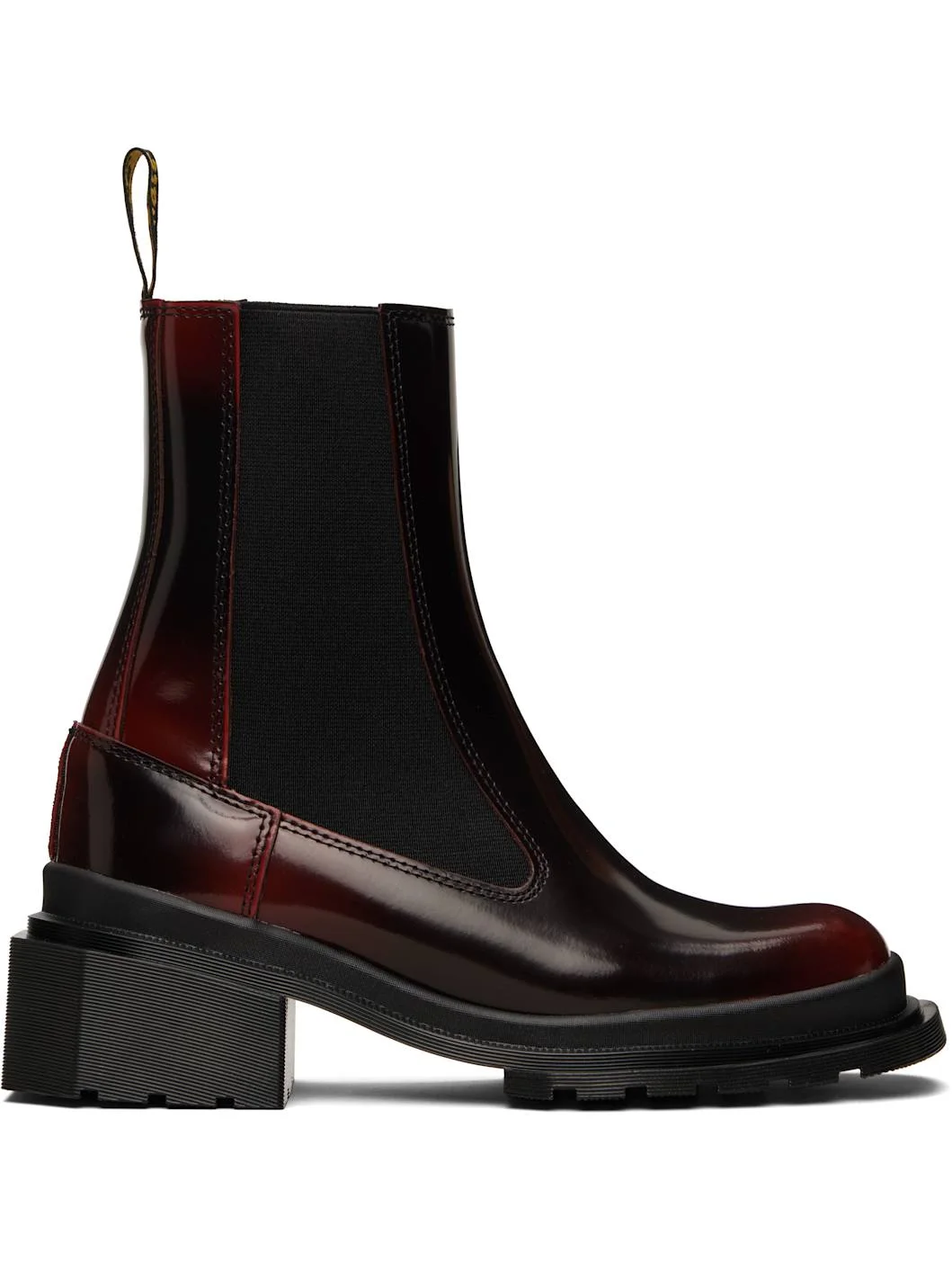 Ankle-high polished leather Chelsea boots. · Square toe · Elasticized gusset at sides · Logo-woven pull-loop at heel collar · Rubber block heel · Treaded Air Cushion rubber sole · Heel: H1.5" Supplier color: Black/Cherry Red/Arcadia Upper: leather. Sole: rubber. Made in Viet Nam 261399F113009