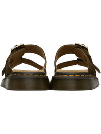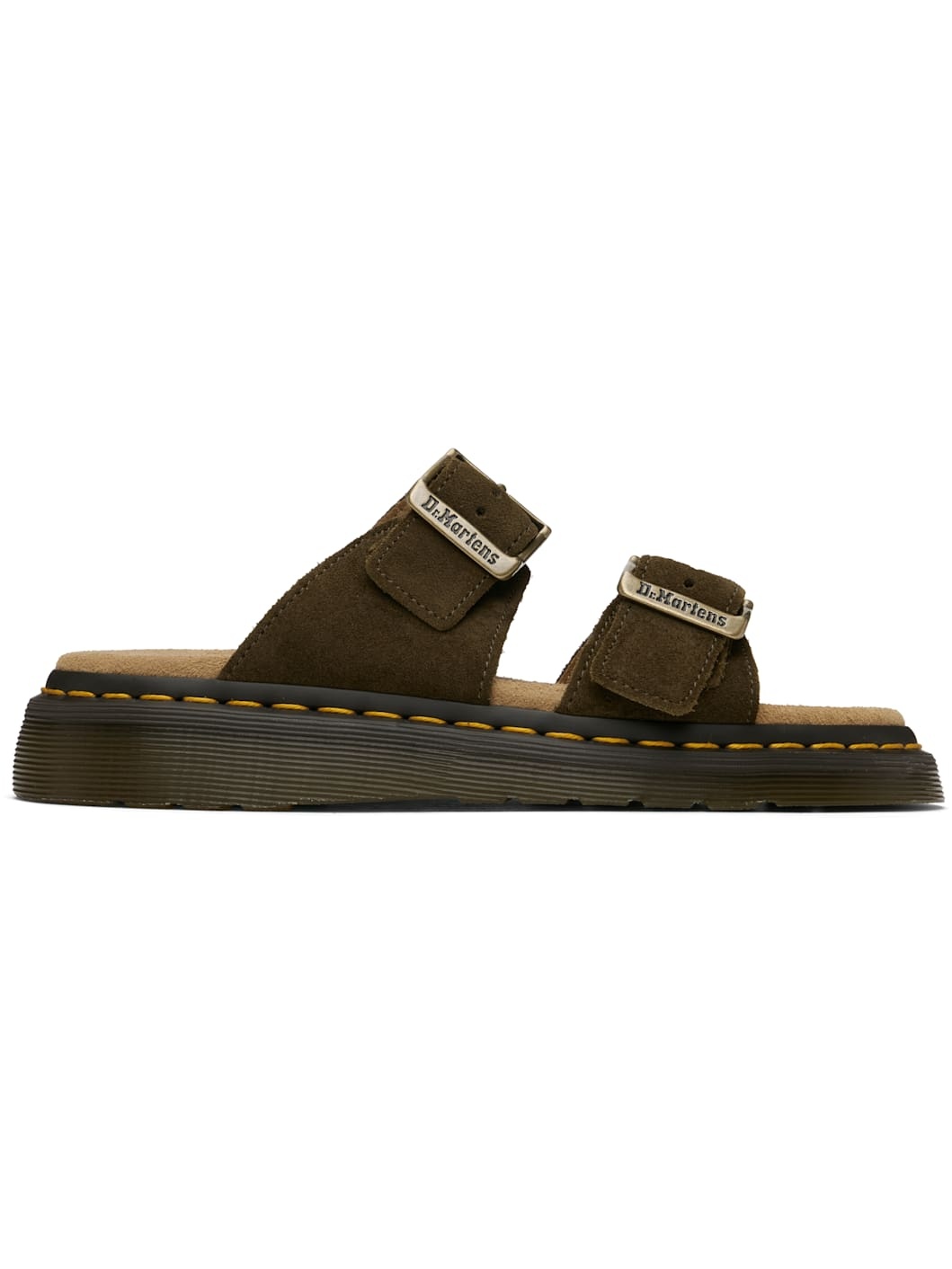 Suede sandals in khaki. · Open toe · Pin-buckle straps at vamp · Logo embossed at padded footbed · Yellow topstitching at heat-sealed Goodyear welt · Textured Air Cushion rubber platform midsole · Treaded rubber sole · Logo-engraved antiqued gold-tone hardware · Platform: H1.25" Supplier color: Olive/Bronx suede Upper: leather. Sole: rubber. Made in Lao Peoples Republic 251399F124012