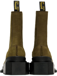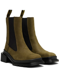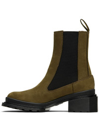 Ankle-high nubuck Chelsea boots in khaki. · Square toe · Elasticized gusset at sides · Logo-woven pull-loop at heel collar · Sculptural rubber block heel · Treaded Air Cushion rubber sole · Heel: H1.5" Supplier color: Olive Upper: leather. Sole: rubber. Made in Viet Nam 252399F113000