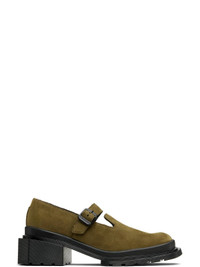 Suede Mary Jane-style loafers in khaki. · Square toe · Pin-buckle strap at vamp · Logo-embossed padded footbed · Rubber block heel · Cemented treaded Air Cushion rubber sole · Logo-engraved black hardware · Heel: H2" Supplier color: Olive Upper: leather. Sole: rubber. Made in Viet Nam 252399F120003
