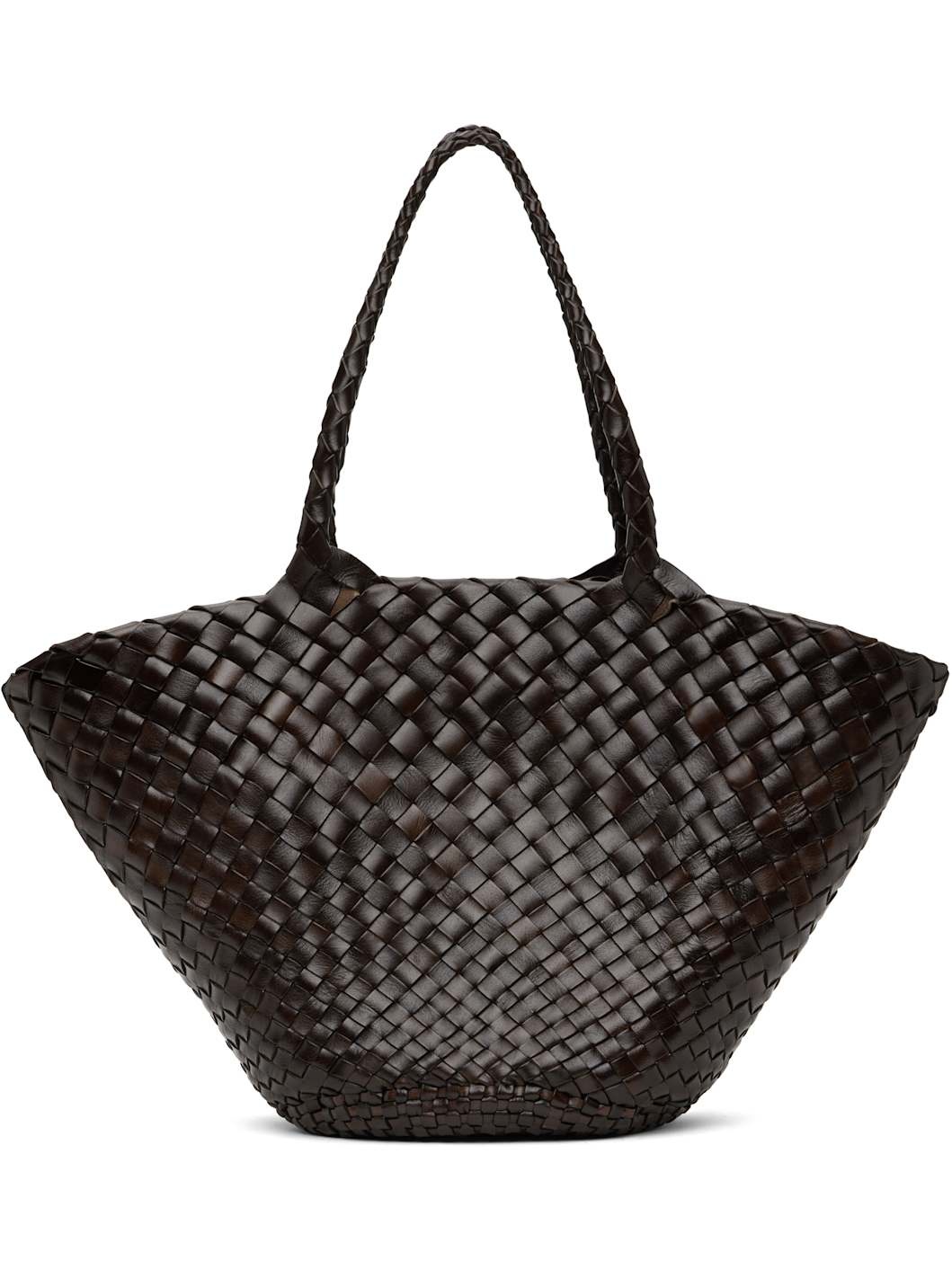 Handcrafted basket-woven buffalo calfskin tote in brown. · Twin carry handles · Open throat · Logo disc hand-sewn at interior · Unlined · H17.5" x W10.5" x D6" · Total height: H19.5" Supplier color: Dark brown Buffalo calfskin. Made in India 251243F049008