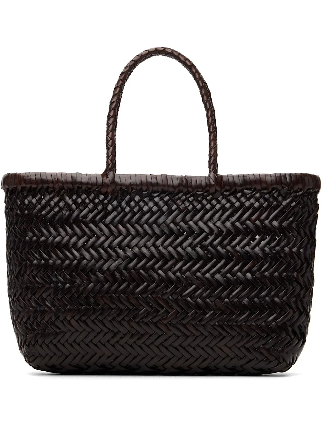 Hand-woven buffalo calfskin top handle bag. · Twin rolled carry handles · Open throat · Logo disc hand-sewn at interior · Unlined · H8.5" x W12" x D2" Supplier color: Dark brown 100% buffalo calfskin. Made in India 261243F046005