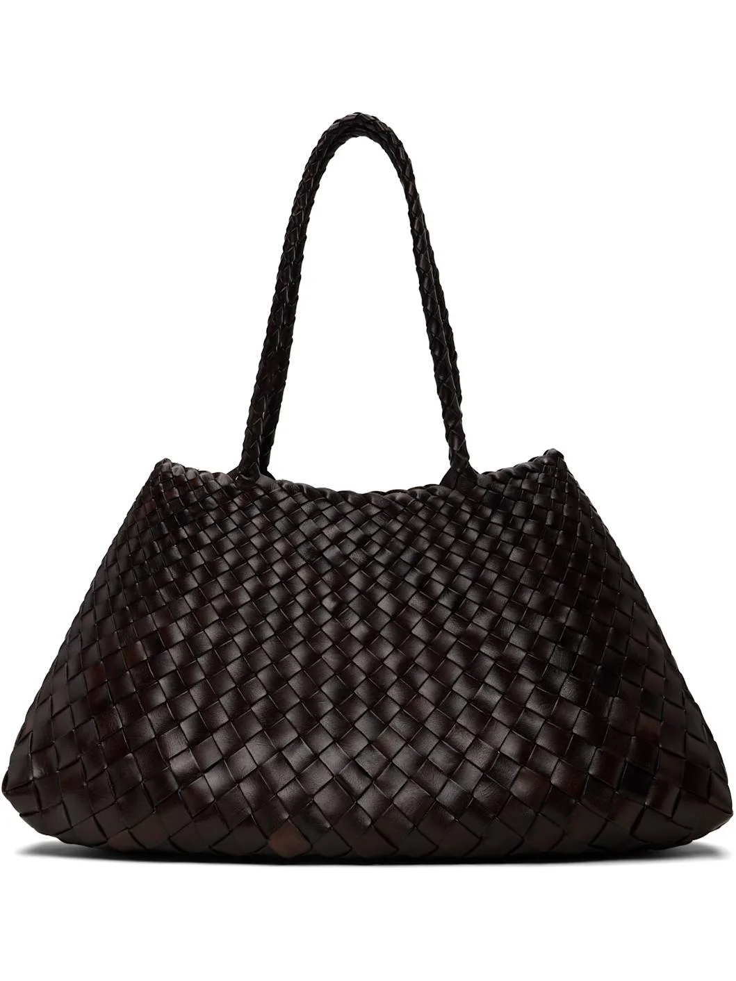 Handcrafted basket-woven buffed buffalo calfskin tote. · Fixed shoulder straps · Open throat · Logo disc hand-sewn at interior · Unlined · H8.75" x W17.25" x D5.5" Supplier color: Dark brown 100% buffalo calfskin. Made in India 261243F049005