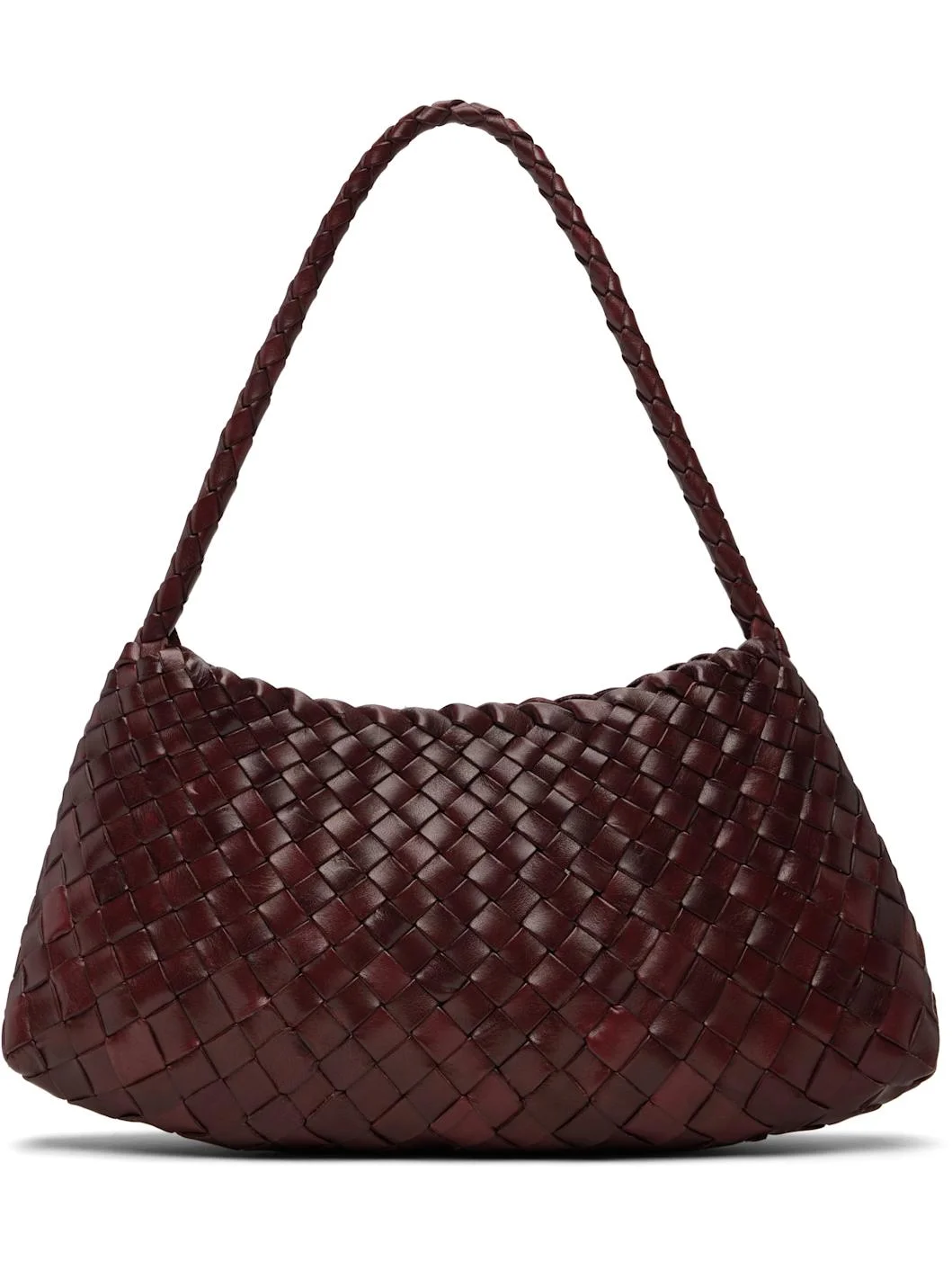 Handcrafted basket-woven buffalo leather shoulder bag. · Fixed shoulder strap · Open throat · Logo disc hand-sewn at interior · Unlined · H6.25" x W13" x D4" Supplier color: Bordo 100% buffalo leather. Made in India 261243F048015